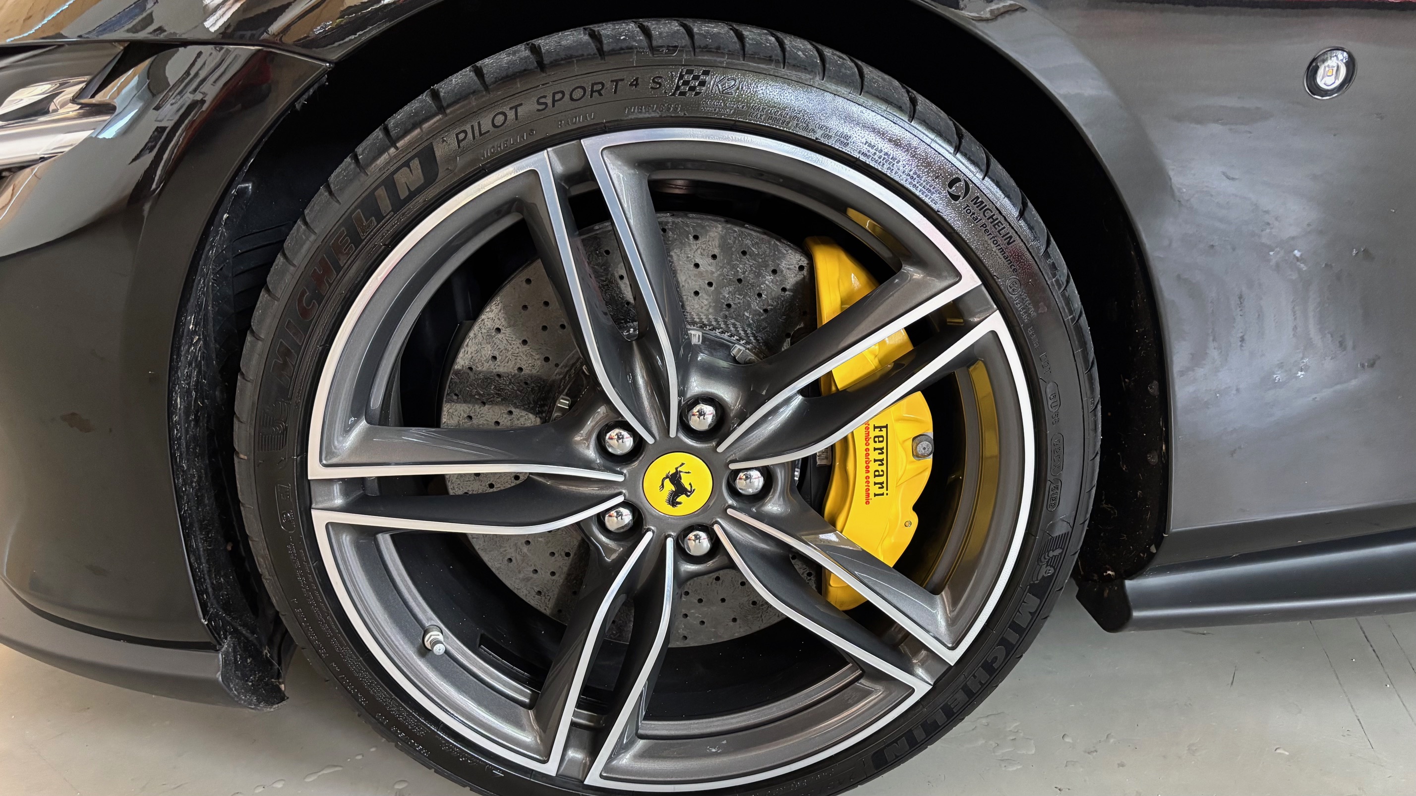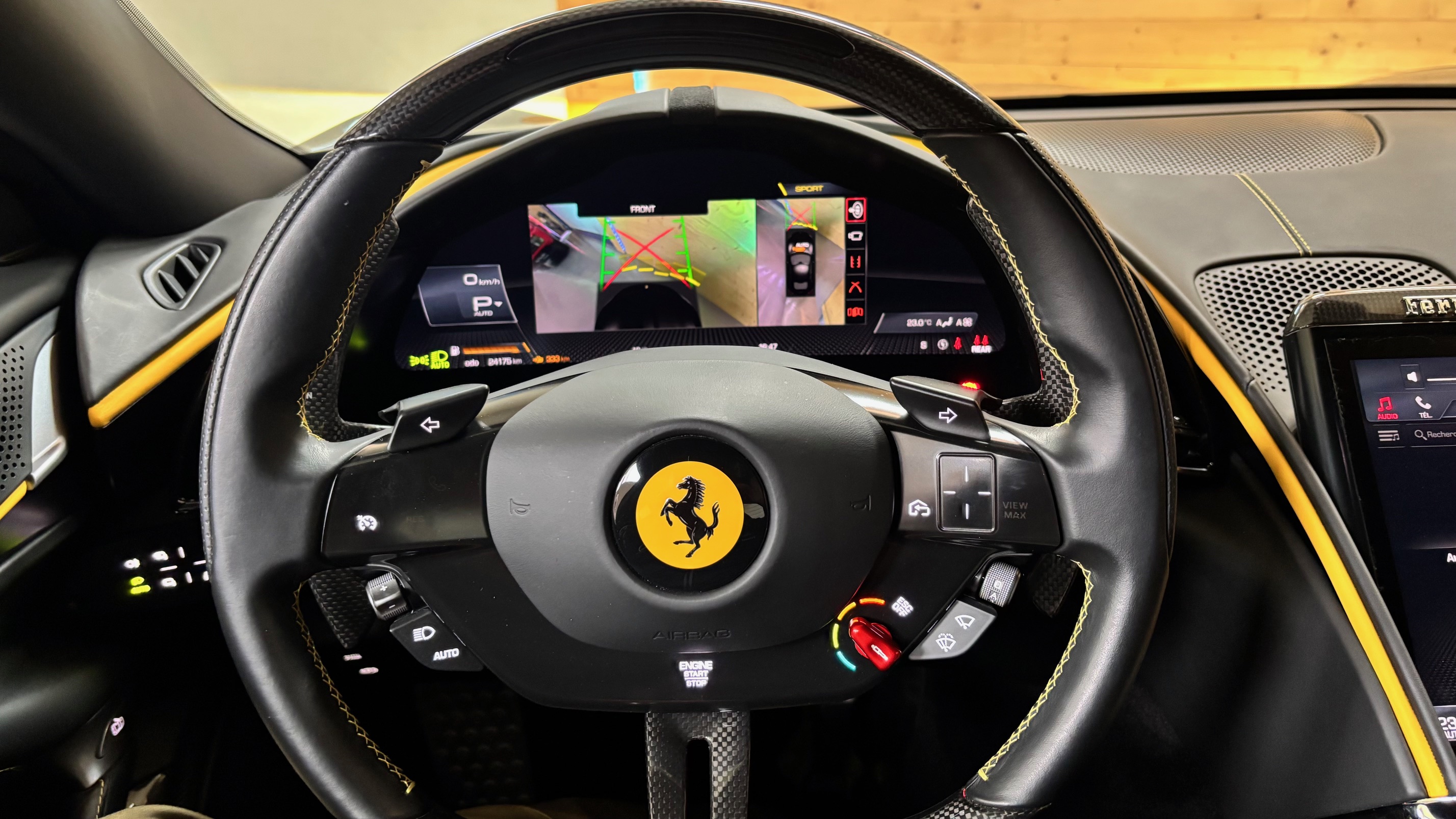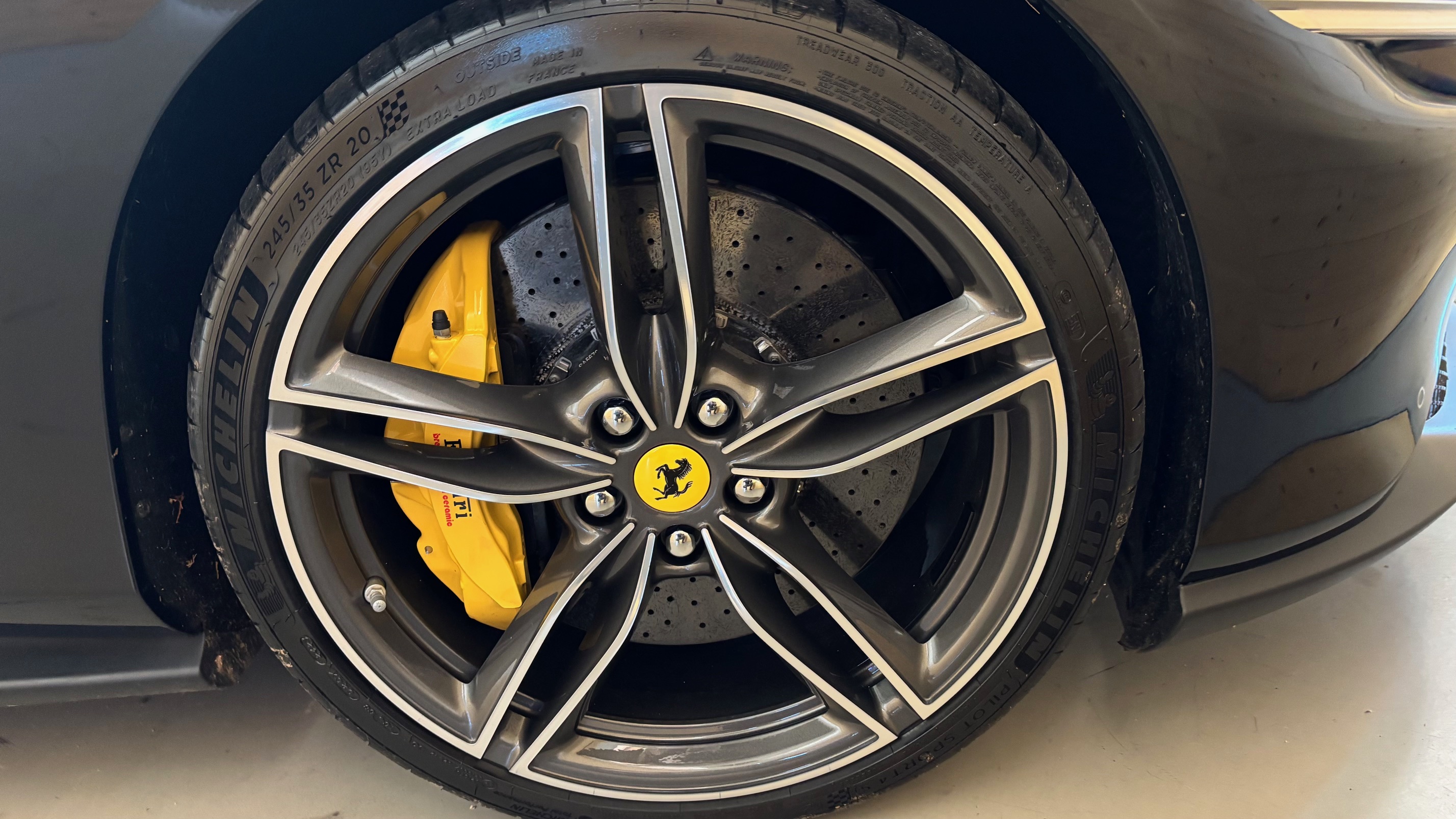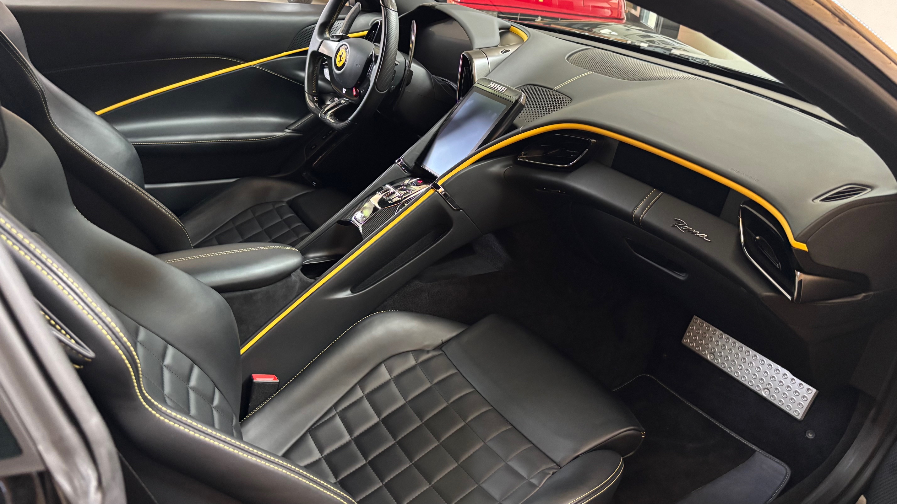 Comme toutes les Roma, elle bénéficie du programme d’entretien étendu comprenant les services, les pièces et la main d’œuvre pendant 7 ans . Le dernier vient d’être réalisé chez Ferrari Bordeaux en septembre 2025, le carnet d’entretien est totalement à jour et dûment rempli. Les quatre pneumatiques Michelin présentent un très faible niveau d’usure ( 10 à 15 % ) . La carrosserie est intégralement protégée par un efficace film PPF invisible de très grande qualité. Nous n’avons relevé aucune imperfection sur celle-ci ni sur les jantes.