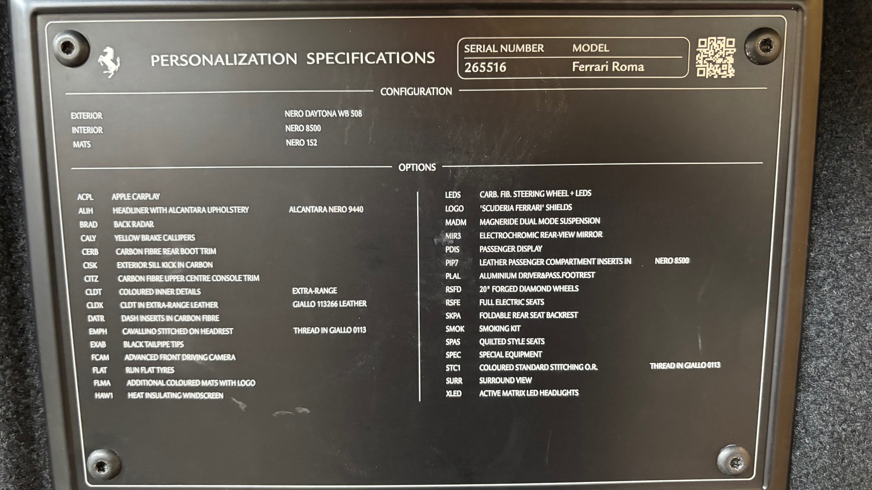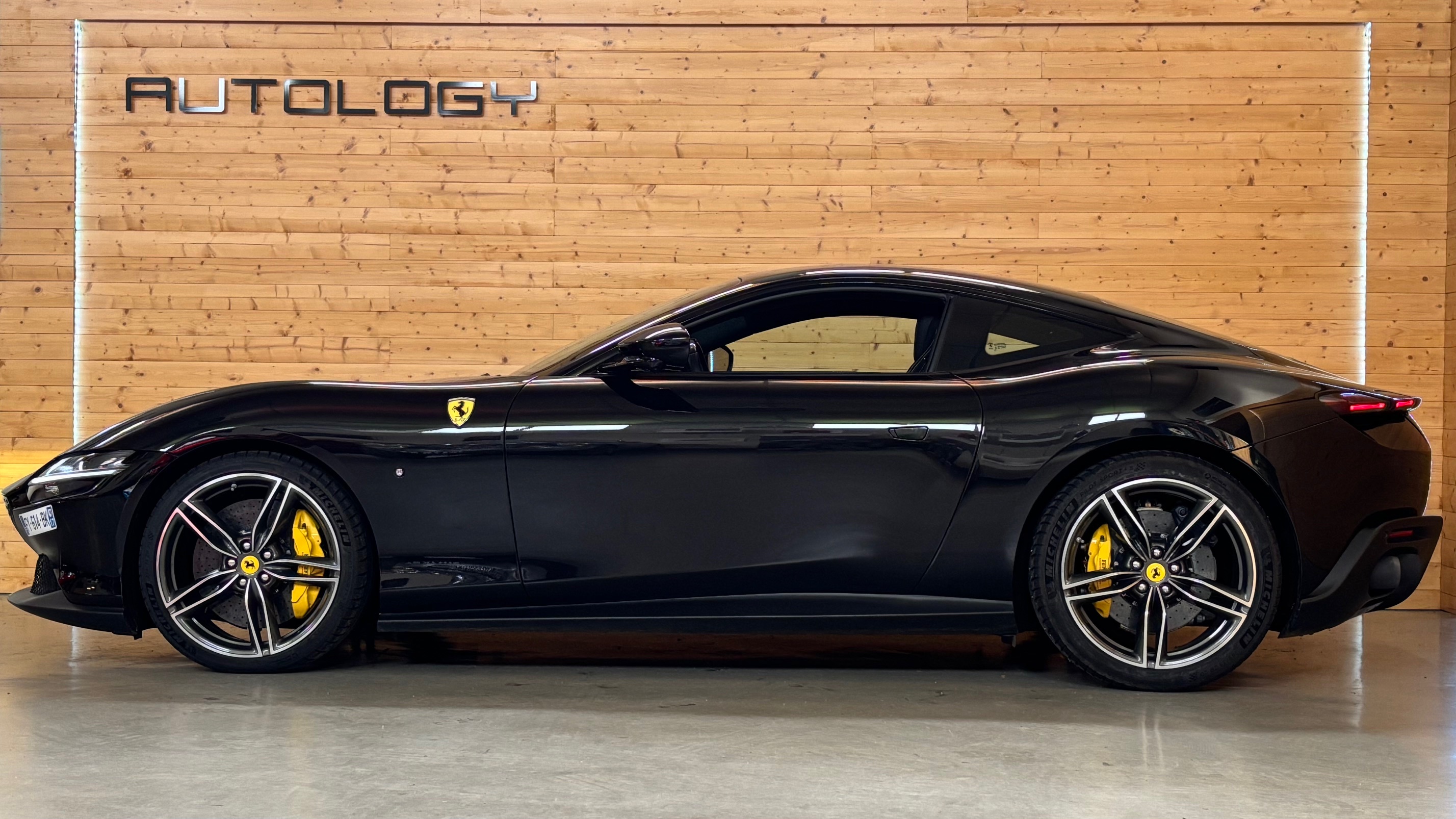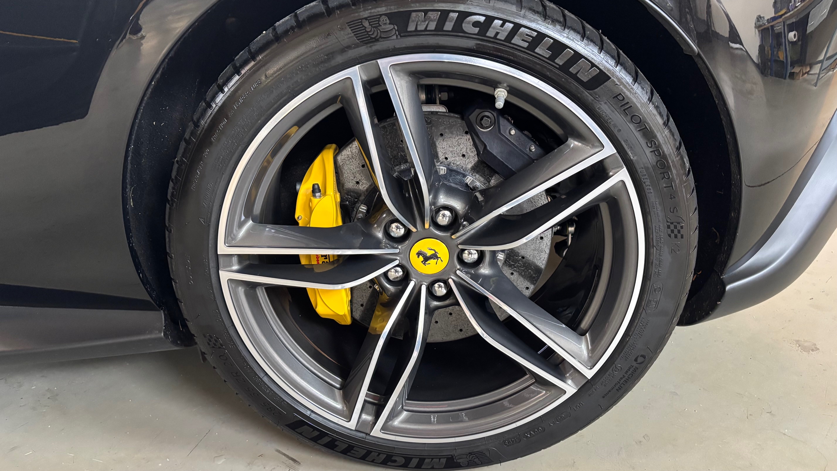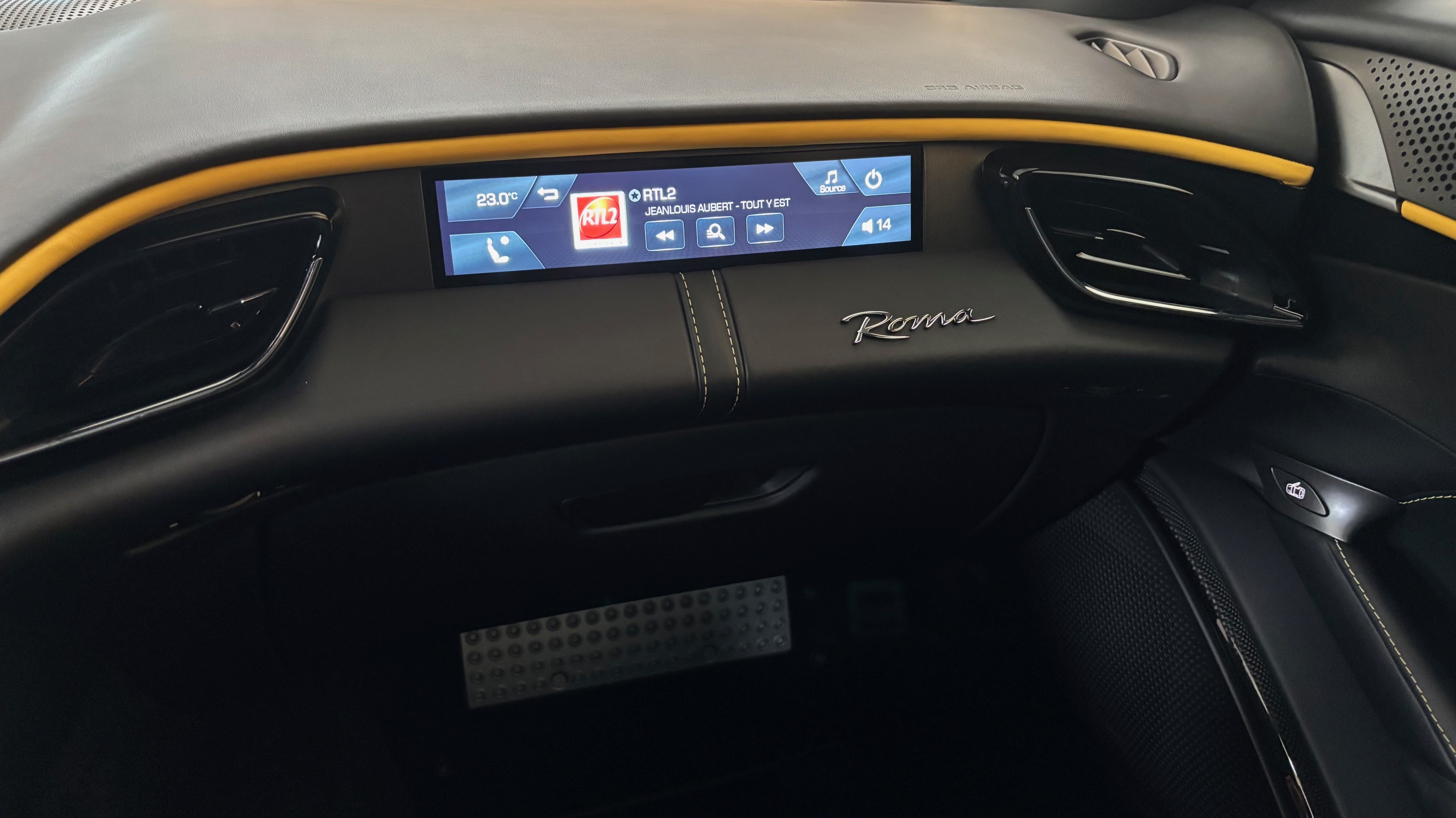 Comme toutes les Roma, elle bénéficie du programme d’entretien étendu comprenant les services, les pièces et la main d’œuvre pendant 7 ans . Le dernier vient d’être réalisé chez Ferrari Bordeaux en septembre 2025, le carnet d’entretien est totalement à jour et dûment rempli. Les quatre pneumatiques Michelin présentent un très faible niveau d’usure ( 10 à 15 % ) . La carrosserie est intégralement protégée par un efficace film PPF invisible de très grande qualité. Nous n’avons relevé aucune imperfection sur celle-ci ni sur les jantes.