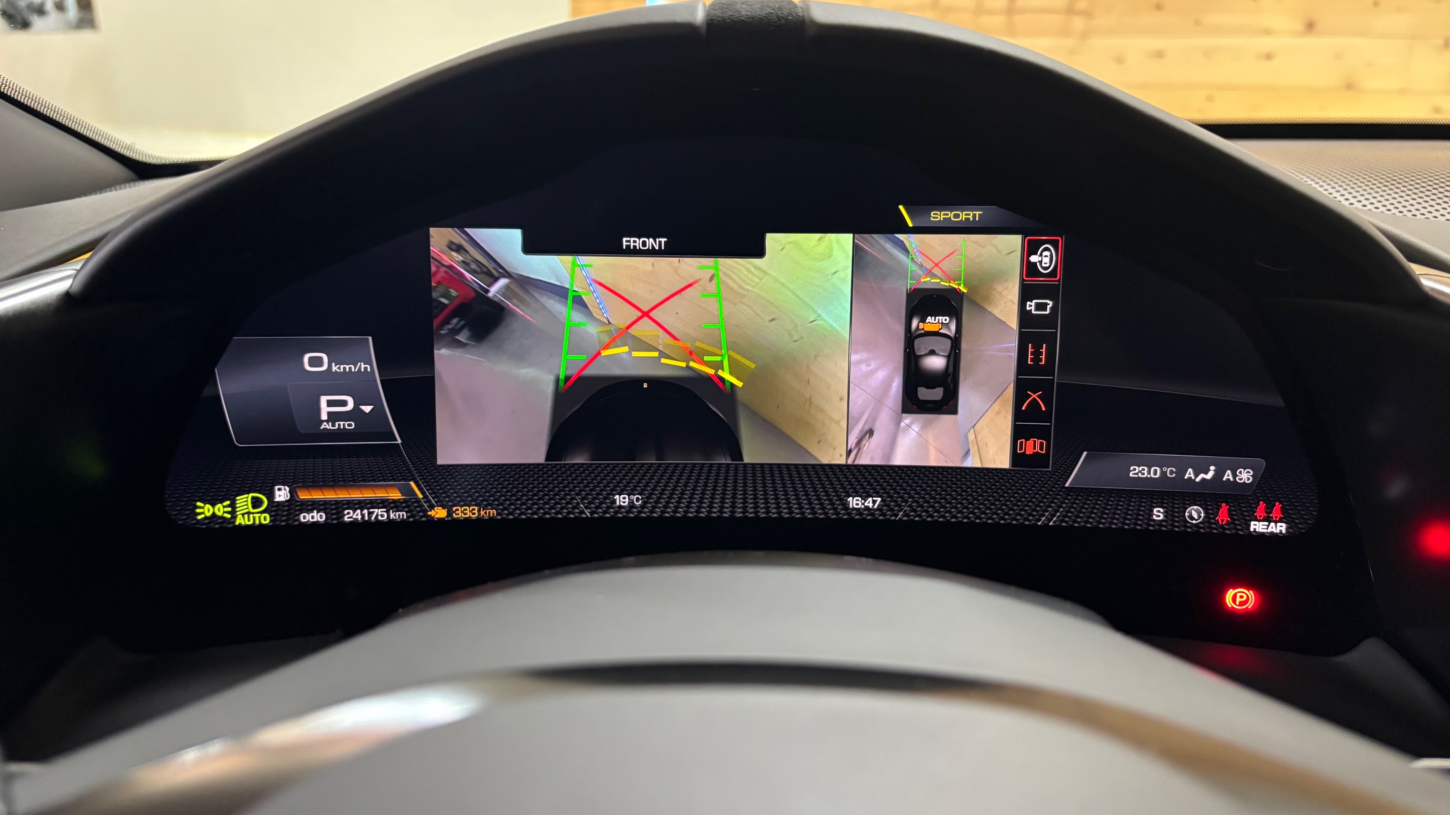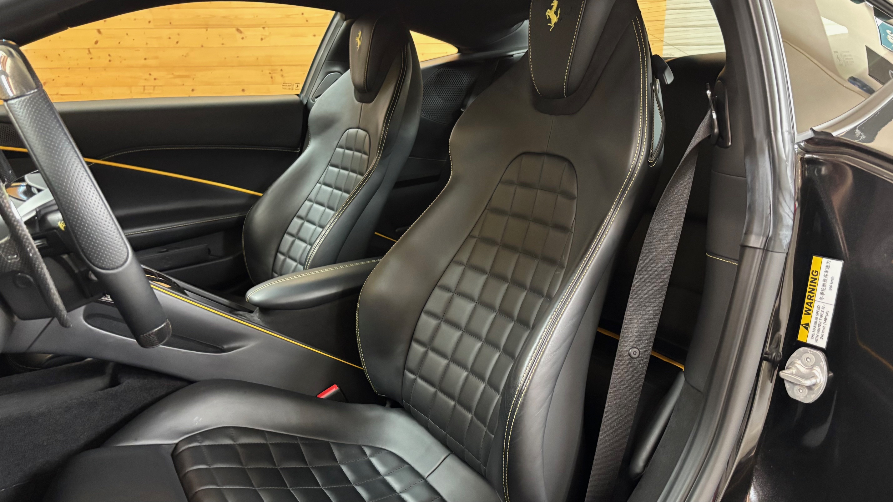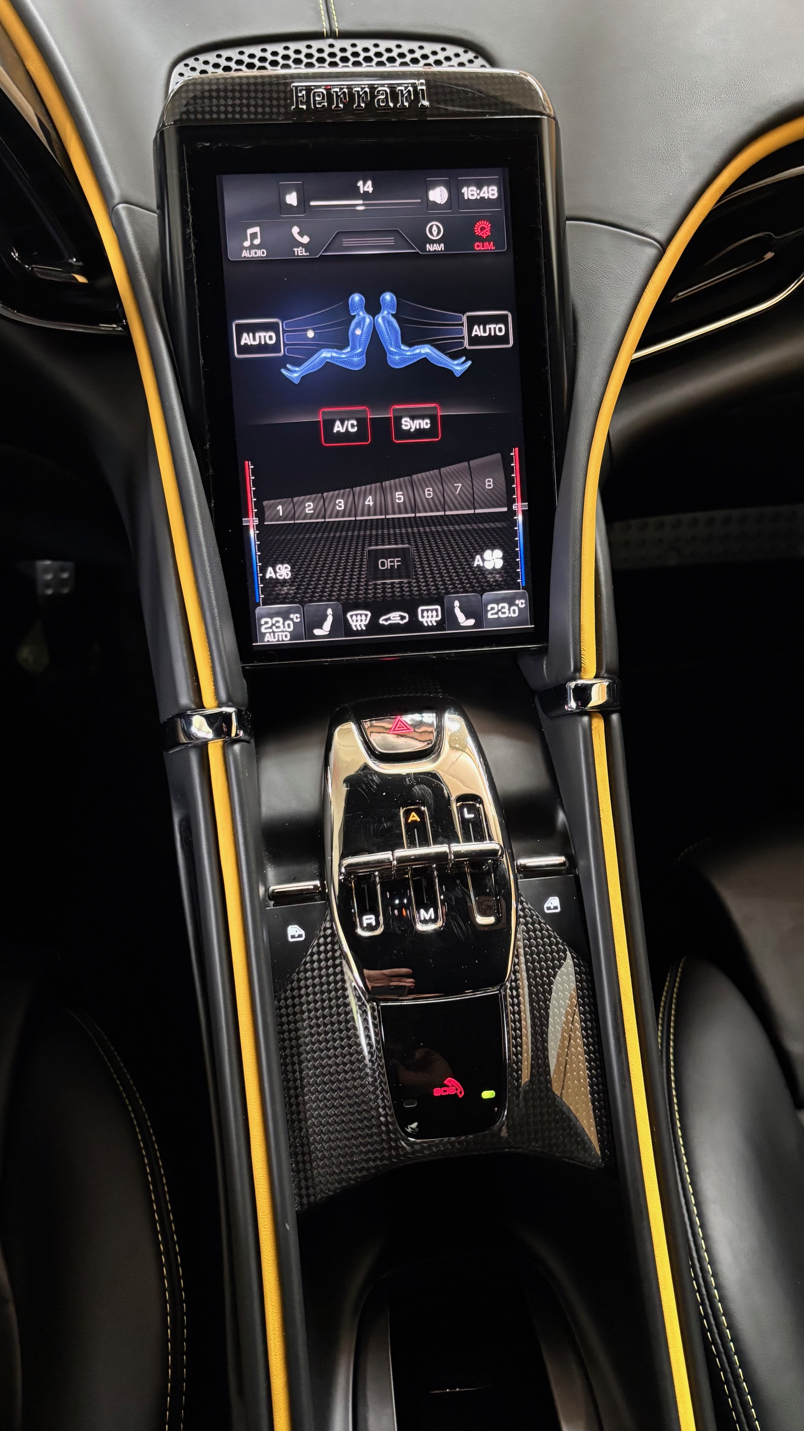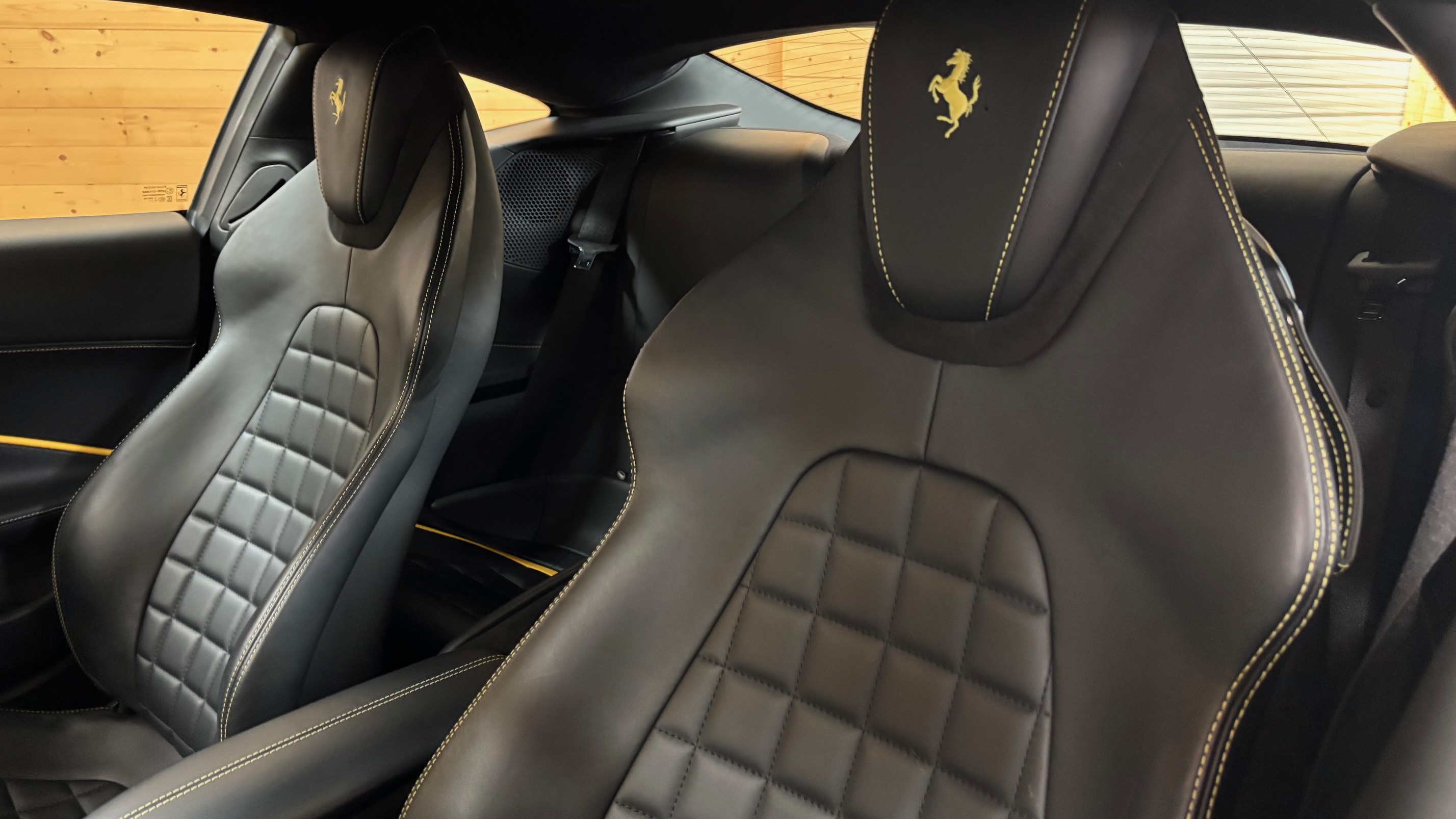 C’est donc un exemplaire de ce sublime coupé Italien que nous vous proposons, modèle livré neuf en France et immatriculé le 24 mars 2021, acquitté bien sûr de son malus écologique. Elle se présente à vous dans un désirable coordonné noir Daytona métallisé, intérieur cuir noir matelassé serti d’un liseret jaune sur le tableau de bord et les contreportes, réalisant un élégant rappel des étriers de freins céramiques. La console centrale et le volant s’habillent du carbone verni optionnel, et du cuir surpiqué. Les appuis tête sont également frappés du Cavallino .