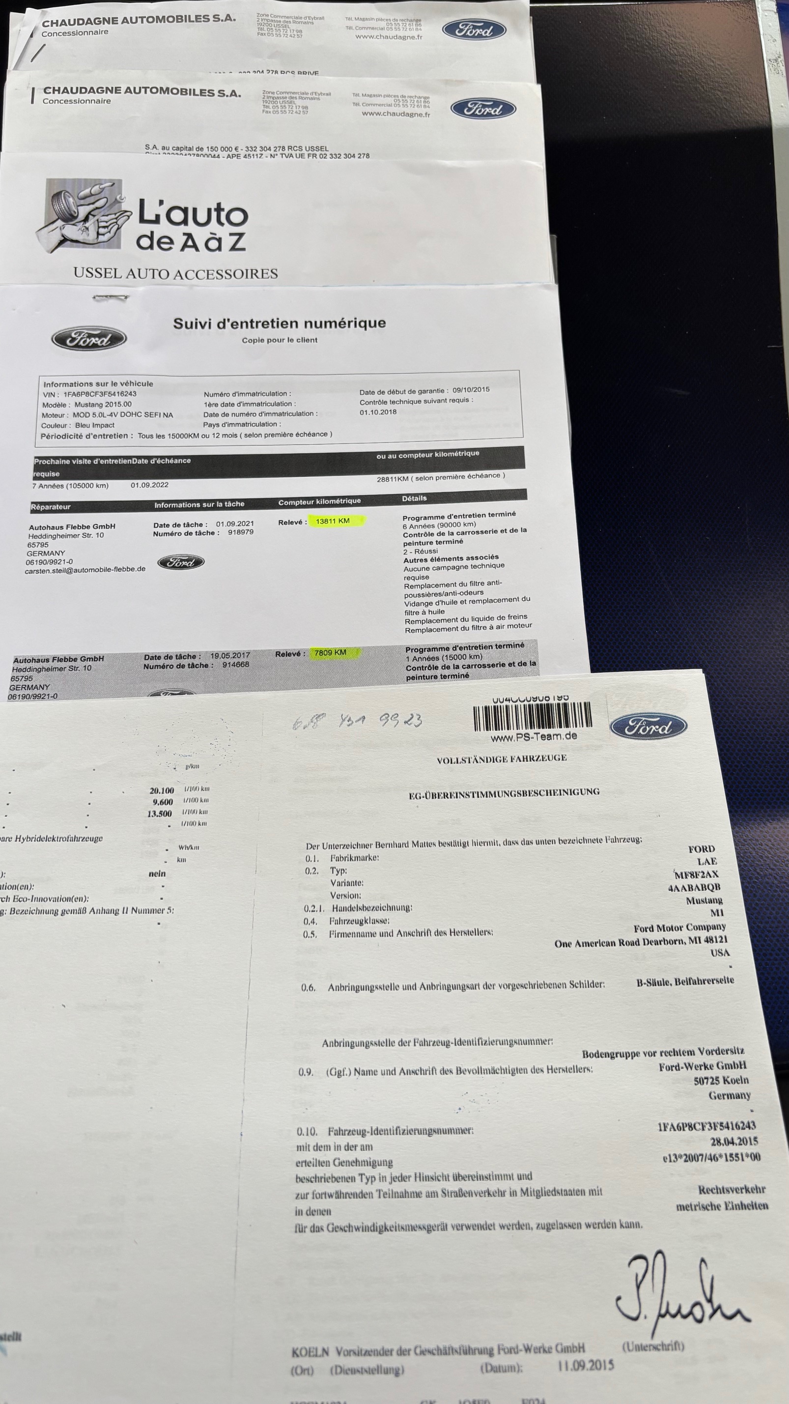 Nous sommes en possession de son certificat de conformité et de toutes ses factures d’entretien faîtes chez les concessionnaires FORD en Allemagne puis en France à 7809 kms, 13811 kms,19682 kms,23229 kms…