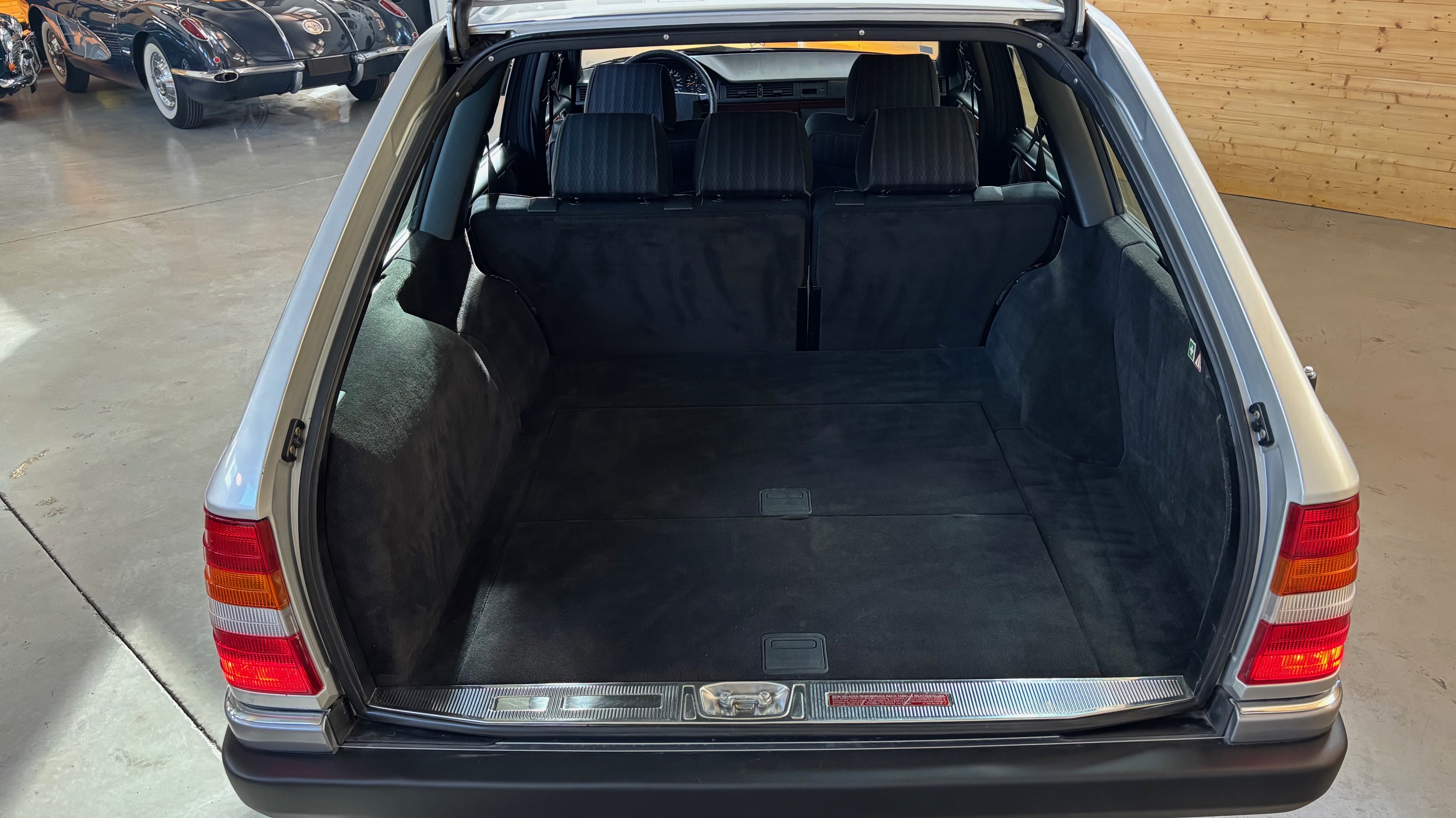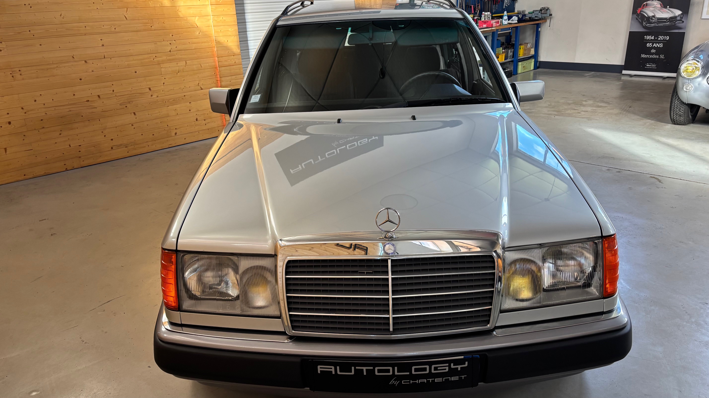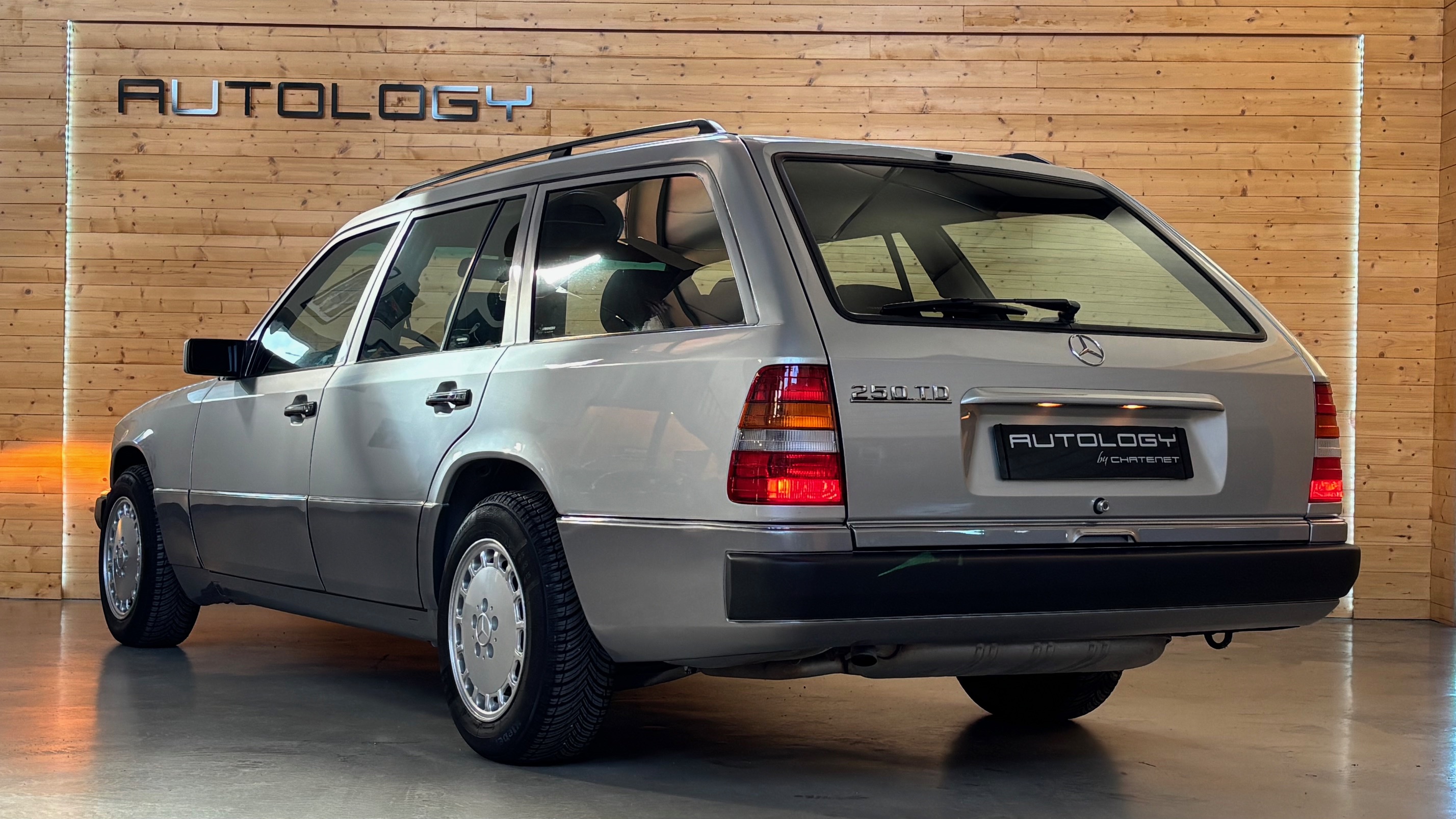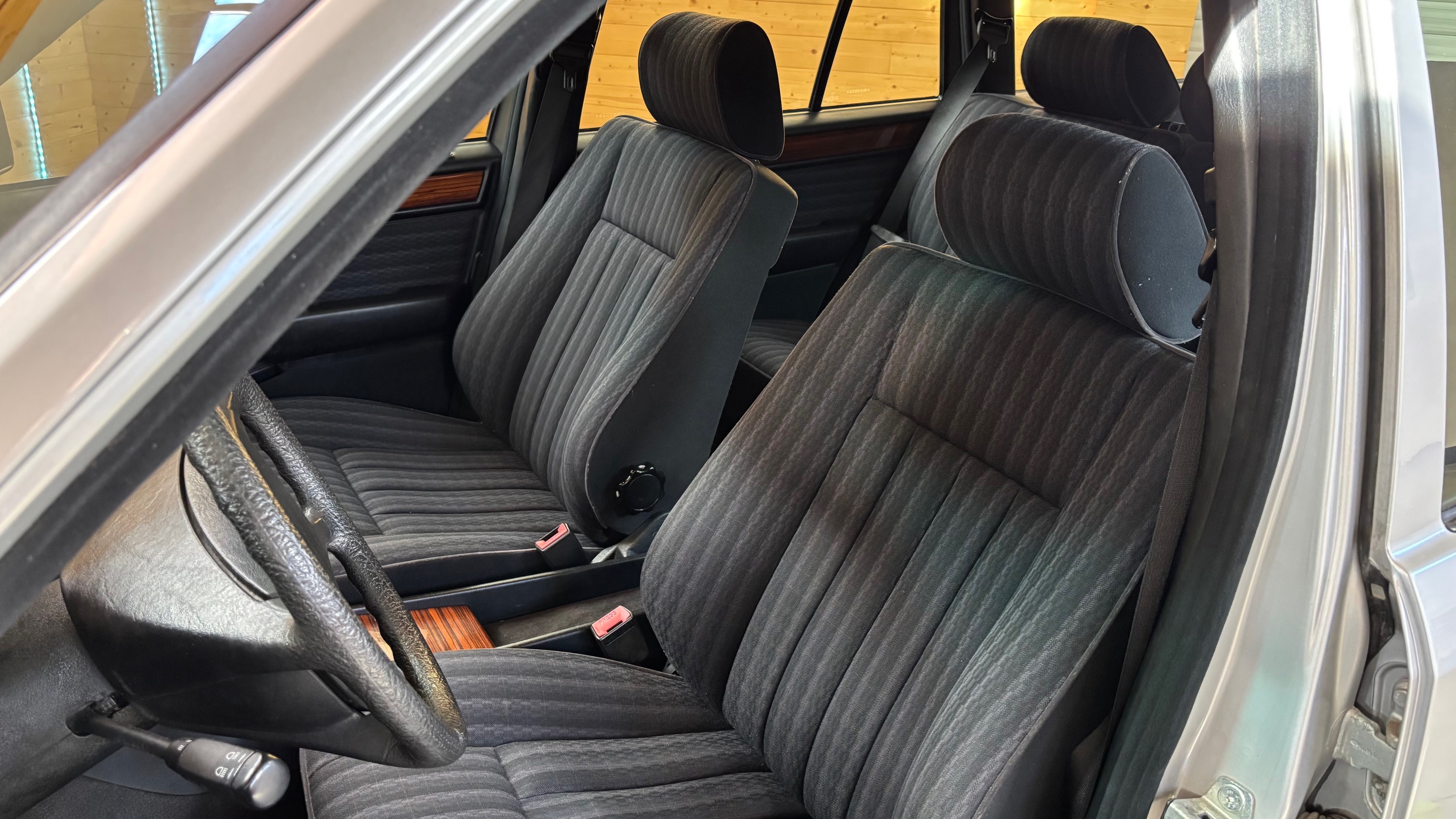 Ce modèle, argent astral/ tissu noir, était une version « Contact », lancée par le constructeur aux débuts des années 90. L’importateur Français voulait (dans sa grande générosité ?) proposer des modèles au tarif d’accroche plus accessibles. Il s’agissait des 190 d et 2.5 d ainsi que des 250 d, berlines et breaks. Concernant ce dernier, pour lequel le futur client devait tout de même à l’époque signer un chèque de 223354 francs, il se voyait supprimé : les deux miroirs de courtoisies éclairés, l’accoudoir central avant amovible et le cache bagages à enrouleur…Qui a dit mesquin ? Au-delà de ces considérations « marketing » d’un autre temps, notre modèle est absolument EXCEPTIONNEL. Il se présente dans un état que l’on peut comparer sans rougir à celui de sa livraison en mai 1991. Il ne présente aucune trace d’usure, son état « time capsule » indique qu’il a toujours été stocké au sec, sans humidité ni exposition solaire. L’ensemble des rapports de contrôle technique (depuis trente ans), ainsi que les factures, attestent sans le moindre doute de son kilométrage. Totalisant 91995 kms, les vidanges moteur, boîte, ont été réalisées. Inutile de préciser qu’il fonctionne comme un neuf, la boîte automatique lui conférant un confort et une douceur de conduite incomparable. N’ayant aucune option à part la peinture métallisée, nous avons choisi de vous proposer ce break équipé de jantes alliages 15 trous identiques aux optionnelles d’époque. Nous pourrons, si vous le souhaitez, le livrer avec ses roues et enjoliveurs d’origines.
