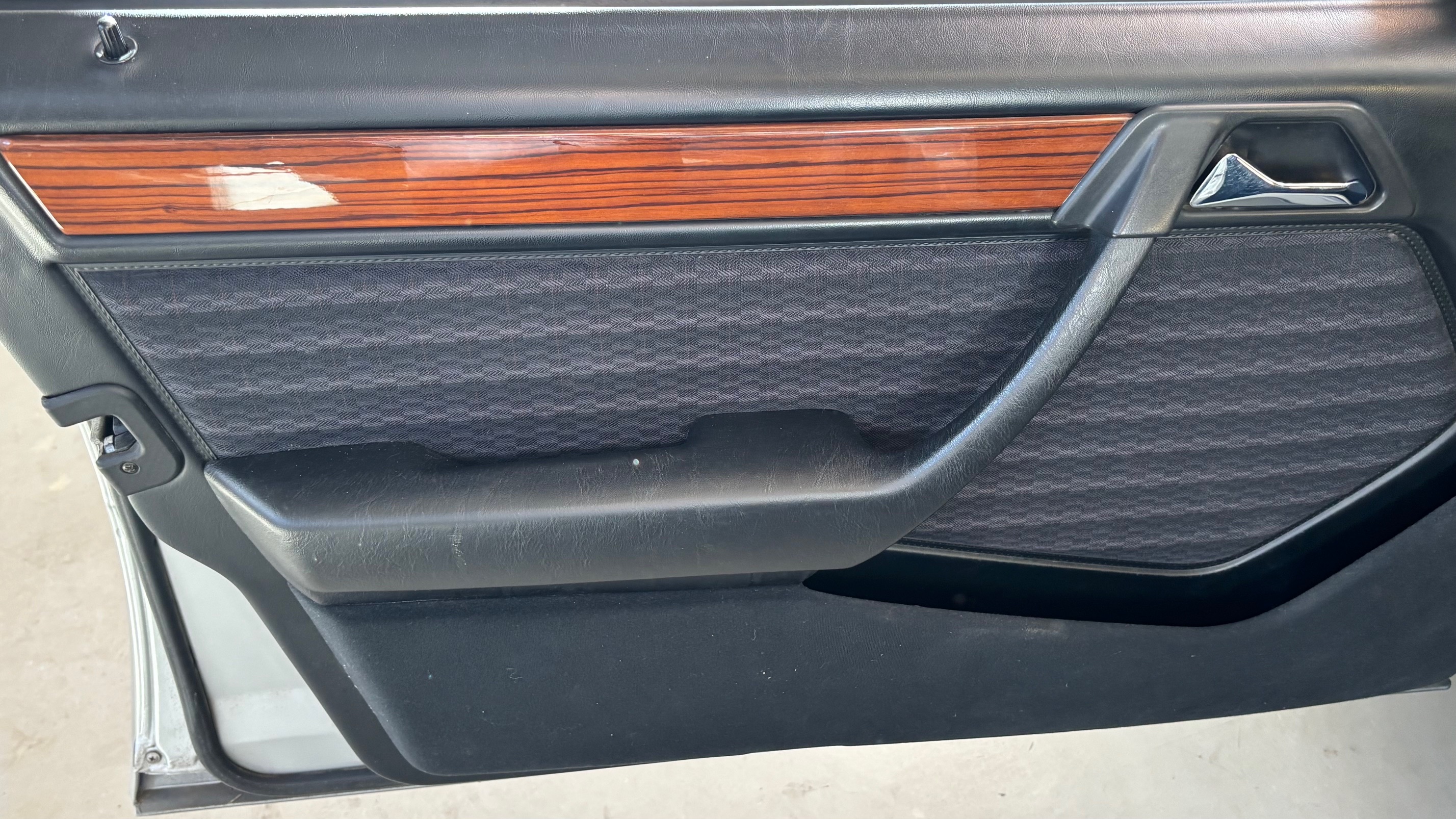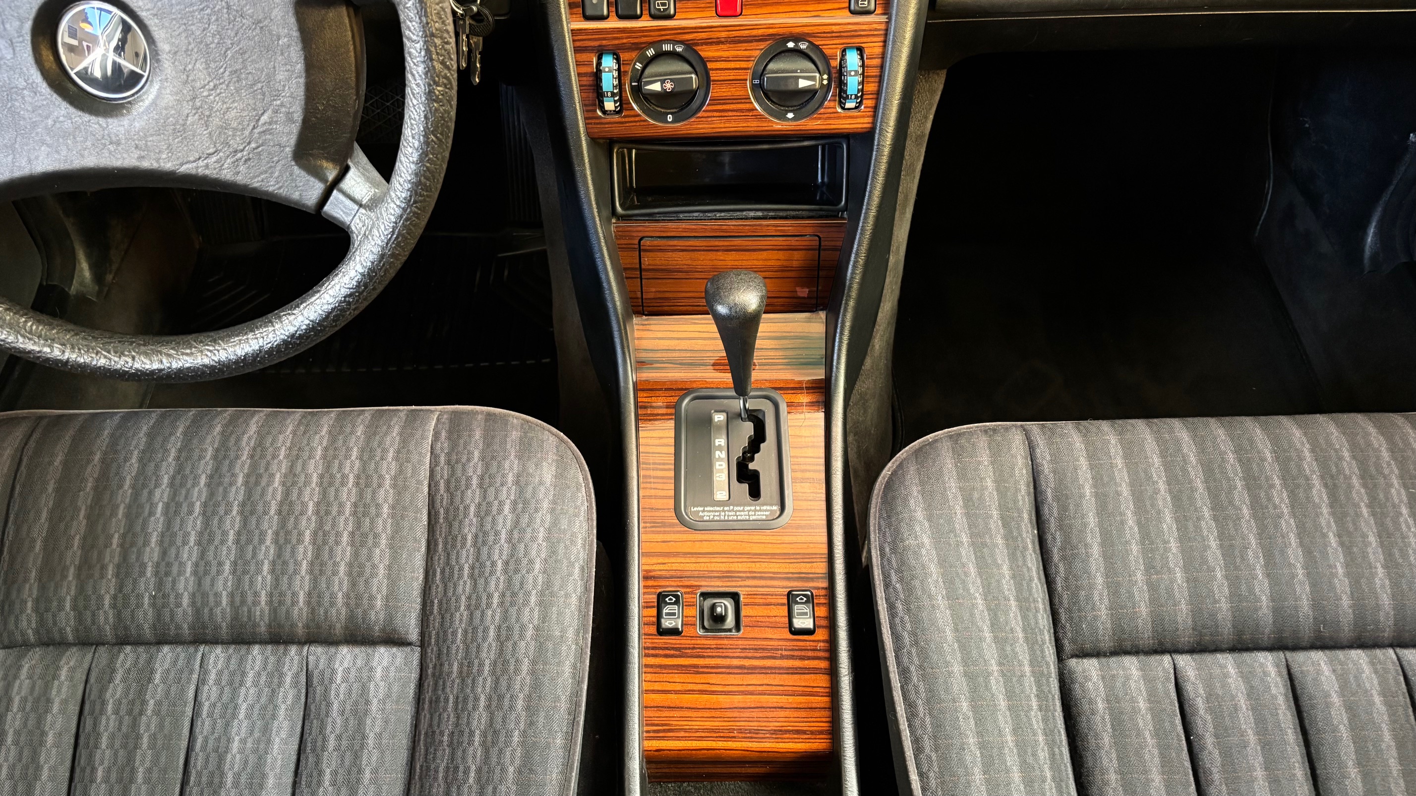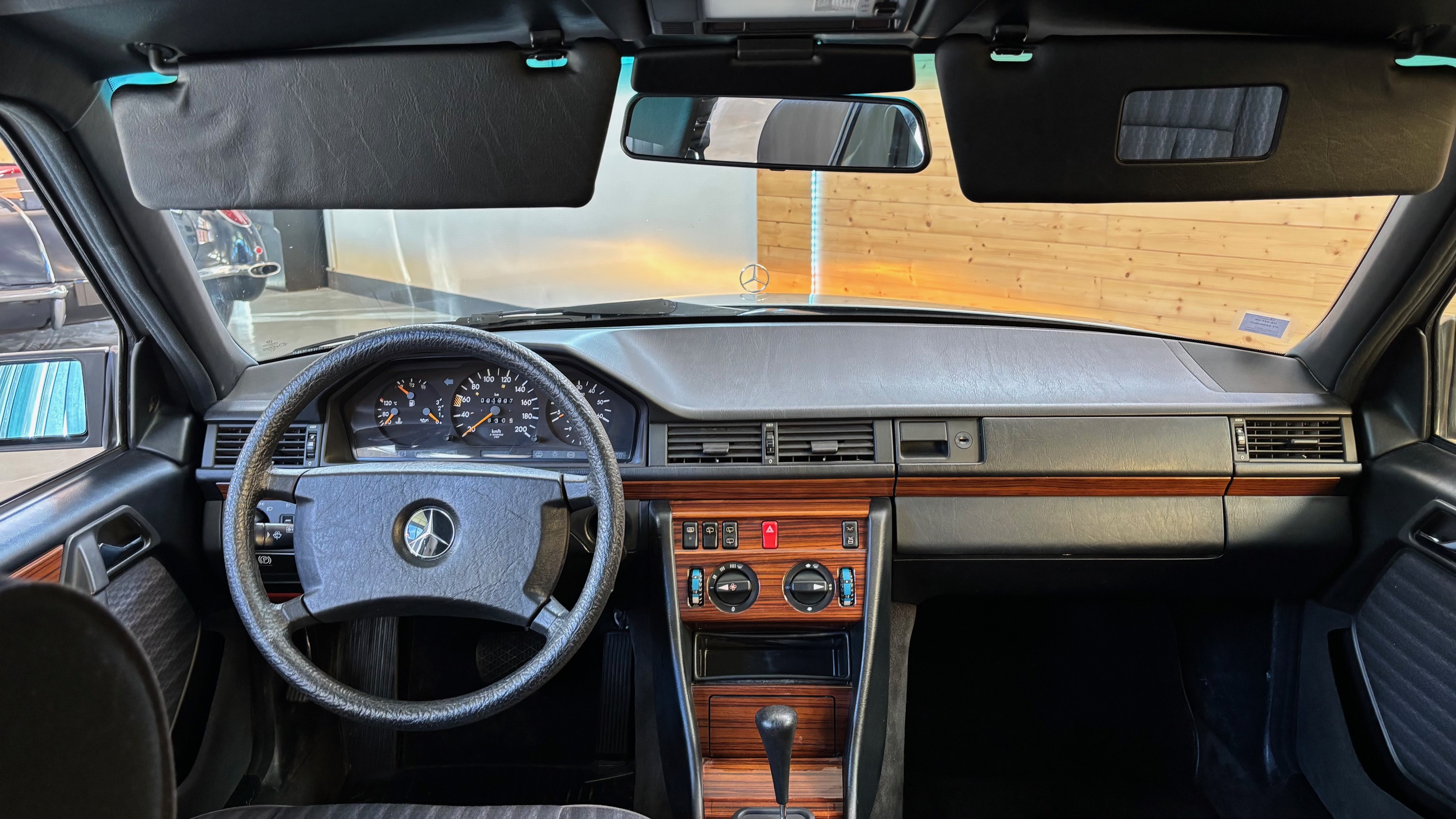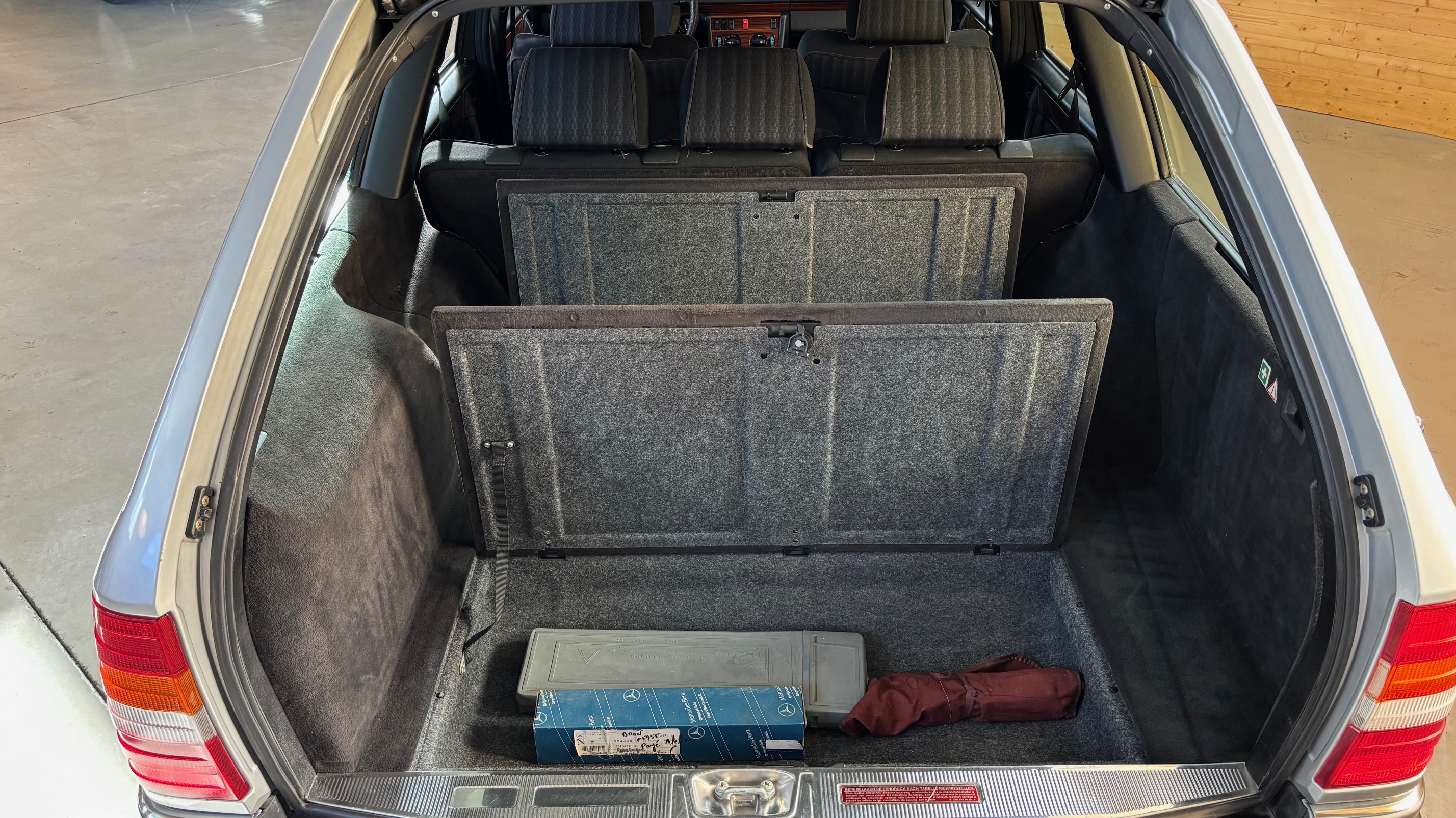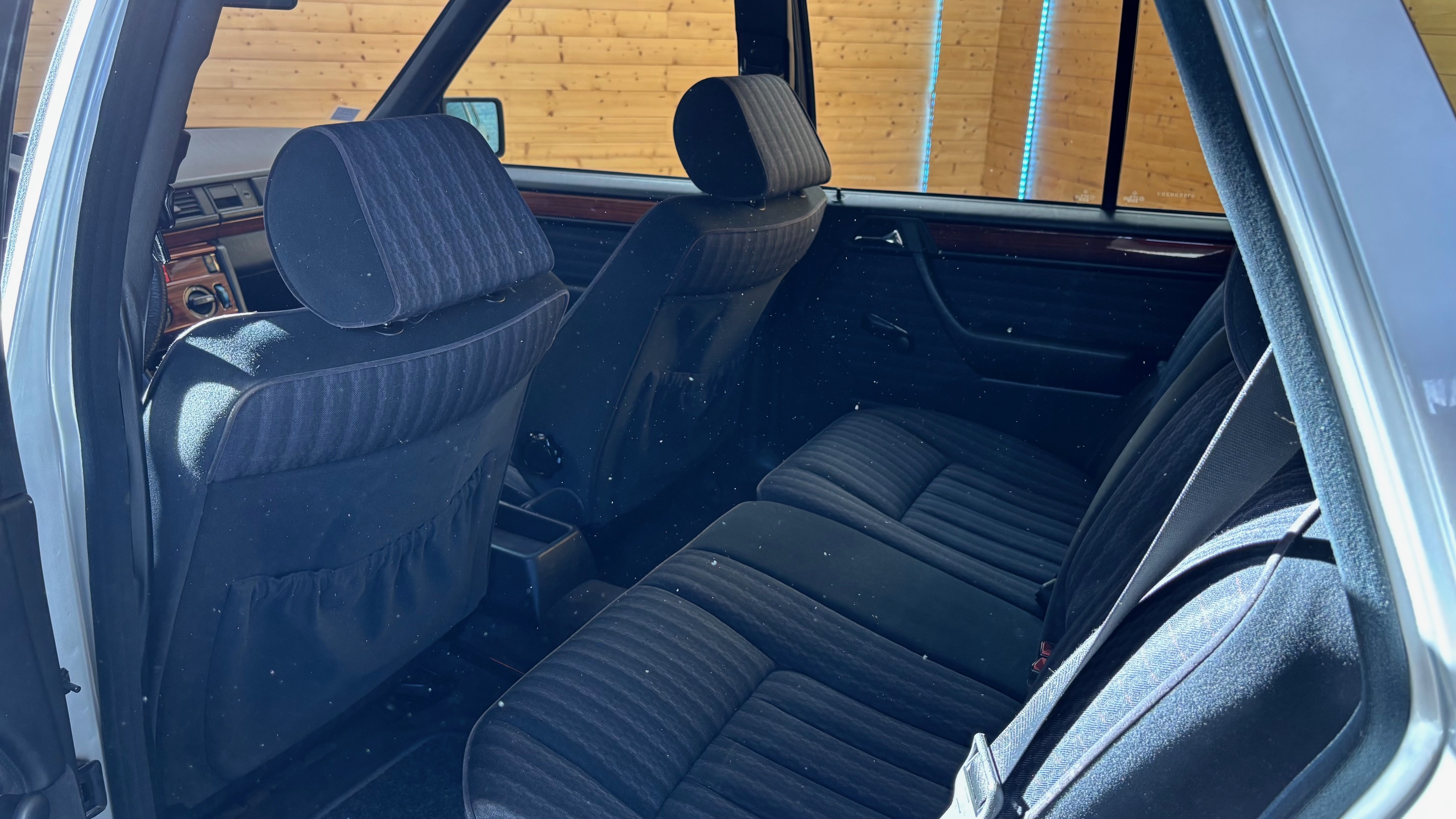 Ce modèle, argent astral/ tissu noir, était une version « Contact », lancée par le constructeur aux débuts des années 90. L’importateur Français voulait (dans sa grande générosité ?) proposer des modèles au tarif d’accroche plus accessibles. Il s’agissait des 190 d et 2.5 d ainsi que des 250 d, berlines et breaks. Concernant ce dernier, pour lequel le futur client devait tout de même à l’époque signer un chèque de 223354 francs, il se voyait supprimé : les deux miroirs de courtoisies éclairés, l’accoudoir central avant amovible et le cache bagages à enrouleur…Qui a dit mesquin ? Au-delà de ces considérations « marketing » d’un autre temps, notre modèle est absolument EXCEPTIONNEL. Il se présente dans un état que l’on peut comparer sans rougir à celui de sa livraison en mai 1991. Il ne présente aucune trace d’usure, son état « time capsule » indique qu’il a toujours été stocké au sec, sans humidité ni exposition solaire. L’ensemble des rapports de contrôle technique (depuis trente ans), ainsi que les factures, attestent sans le moindre doute de son kilométrage. Totalisant 91995 kms, les vidanges moteur, boîte, ont été réalisées. Inutile de préciser qu’il fonctionne comme un neuf, la boîte automatique lui conférant un confort et une douceur de conduite incomparable. N’ayant aucune option à part la peinture métallisée, nous avons choisi de vous proposer ce break équipé de jantes alliages 15 trous identiques aux optionnelles d’époque. Nous pourrons, si vous le souhaitez, le livrer avec ses roues et enjoliveurs d’origines.