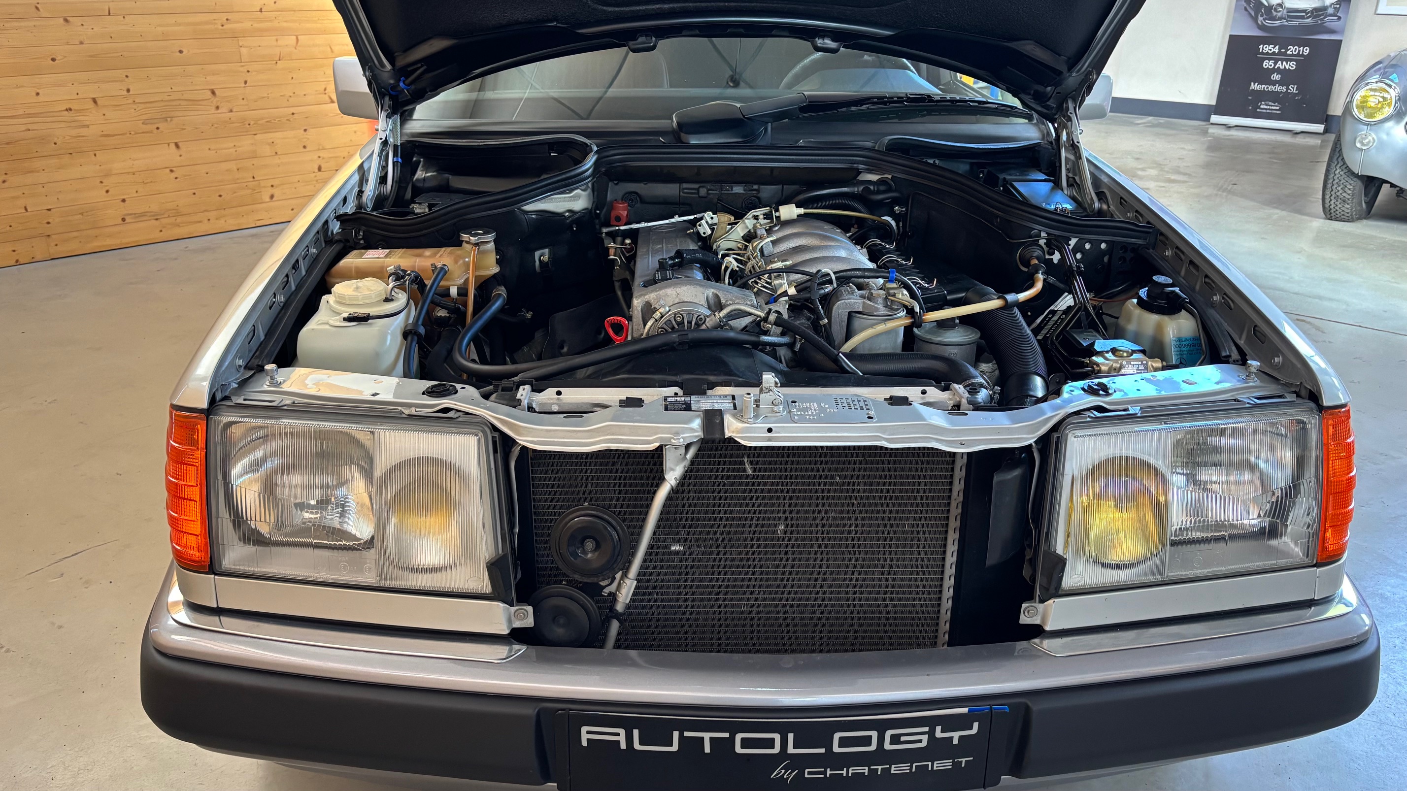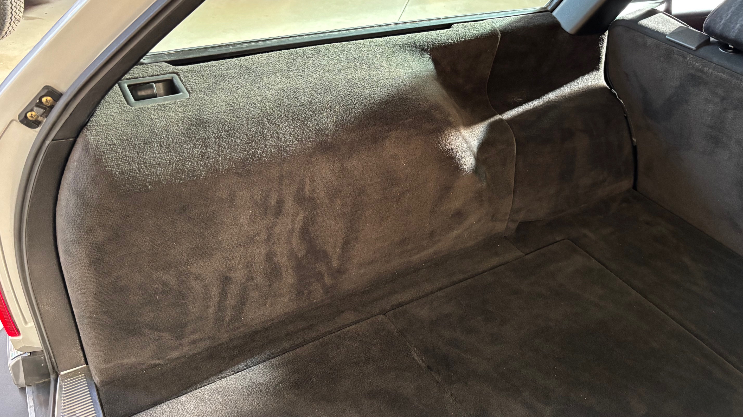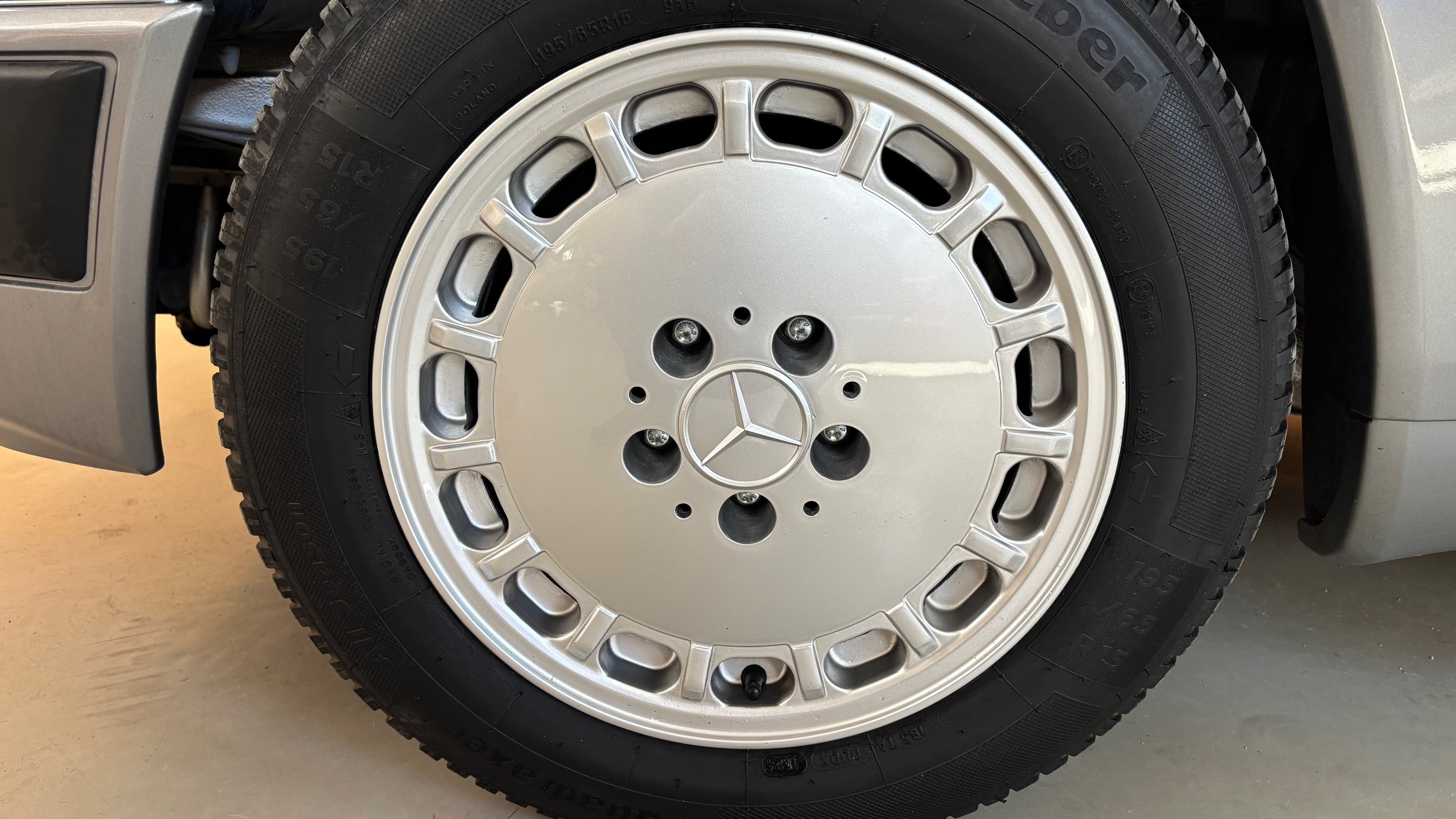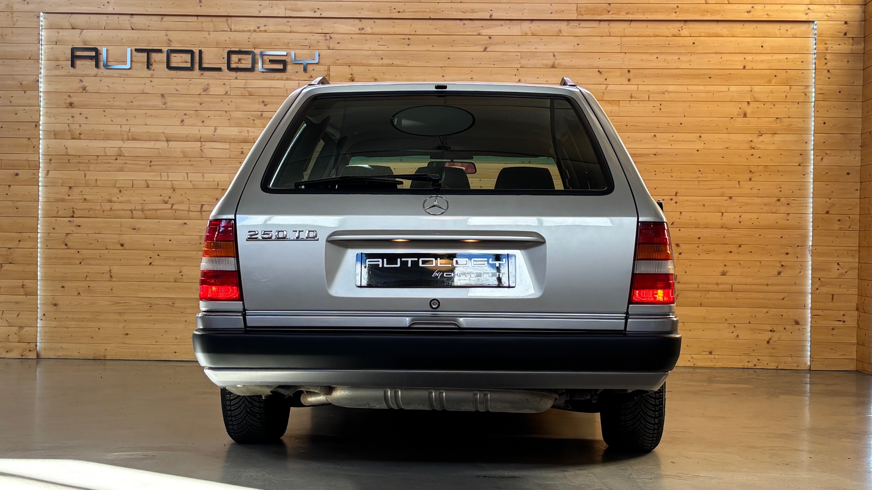 Ce modèle, argent astral/ tissu noir, était une version « Contact », lancée par le constructeur aux débuts des années 90. L’importateur Français voulait (dans sa grande générosité ?) proposer des modèles au tarif d’accroche plus accessibles. Il s’agissait des 190 d et 2.5 d ainsi que des 250 d, berlines et breaks. Concernant ce dernier, pour lequel le futur client devait tout de même à l’époque signer un chèque de 223354 francs, il se voyait supprimé : les deux miroirs de courtoisies éclairés, l’accoudoir central avant amovible et le cache bagages à enrouleur…Qui a dit mesquin ? Au-delà de ces considérations « marketing » d’un autre temps, notre modèle est absolument EXCEPTIONNEL. Il se présente dans un état que l’on peut comparer sans rougir à celui de sa livraison en mai 1991. Il ne présente aucune trace d’usure, son état « time capsule » indique qu’il a toujours été stocké au sec, sans humidité ni exposition solaire. L’ensemble des rapports de contrôle technique (depuis trente ans), ainsi que les factures, attestent sans le moindre doute de son kilométrage. Totalisant 91995 kms, les vidanges moteur, boîte, ont été réalisées. Inutile de préciser qu’il fonctionne comme un neuf, la boîte automatique lui conférant un confort et une douceur de conduite incomparable. N’ayant aucune option à part la peinture métallisée, nous avons choisi de vous proposer ce break équipé de jantes alliages 15 trous identiques aux optionnelles d’époque. Nous pourrons, si vous le souhaitez, le livrer avec ses roues et enjoliveurs d’origines.