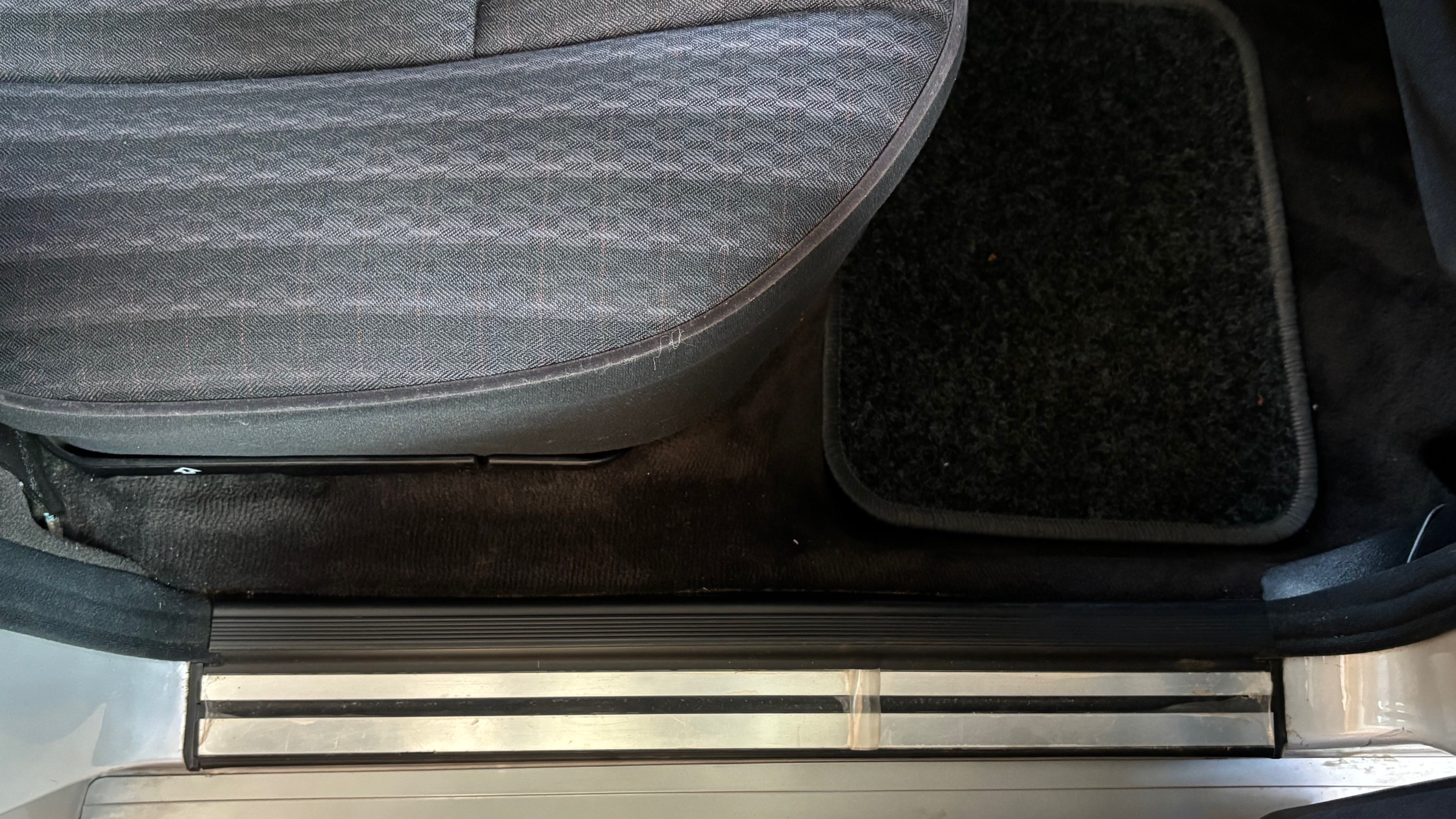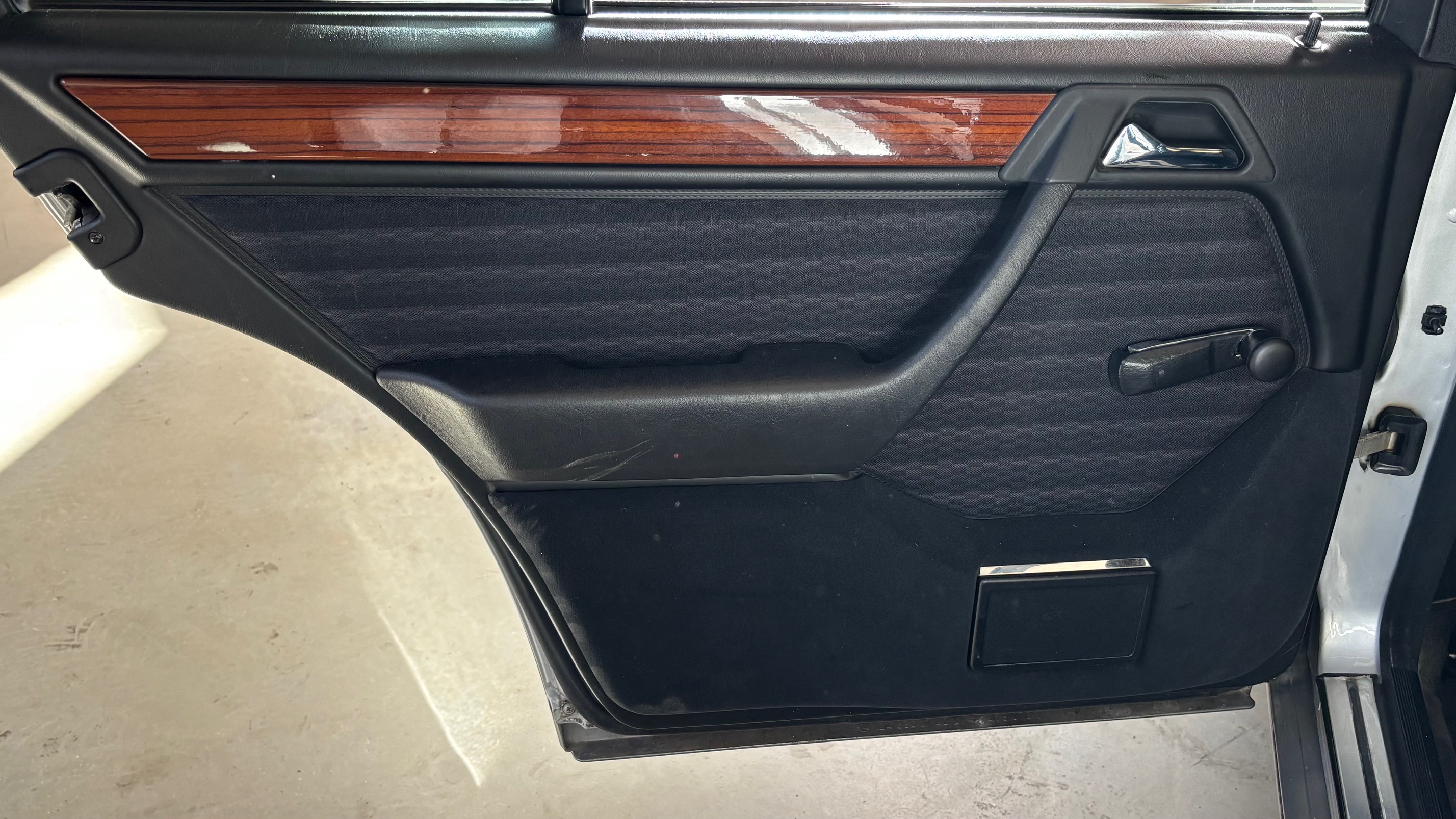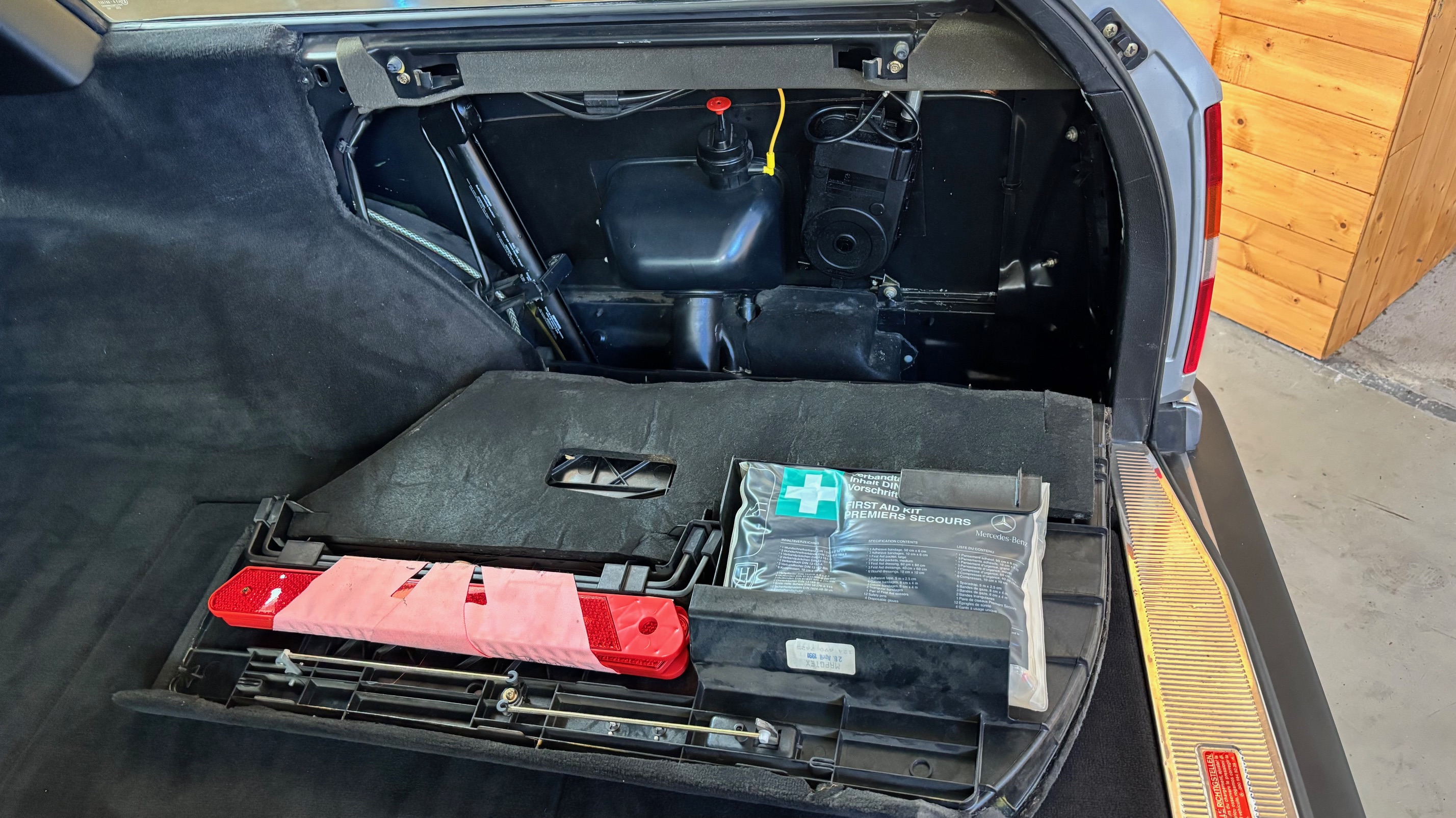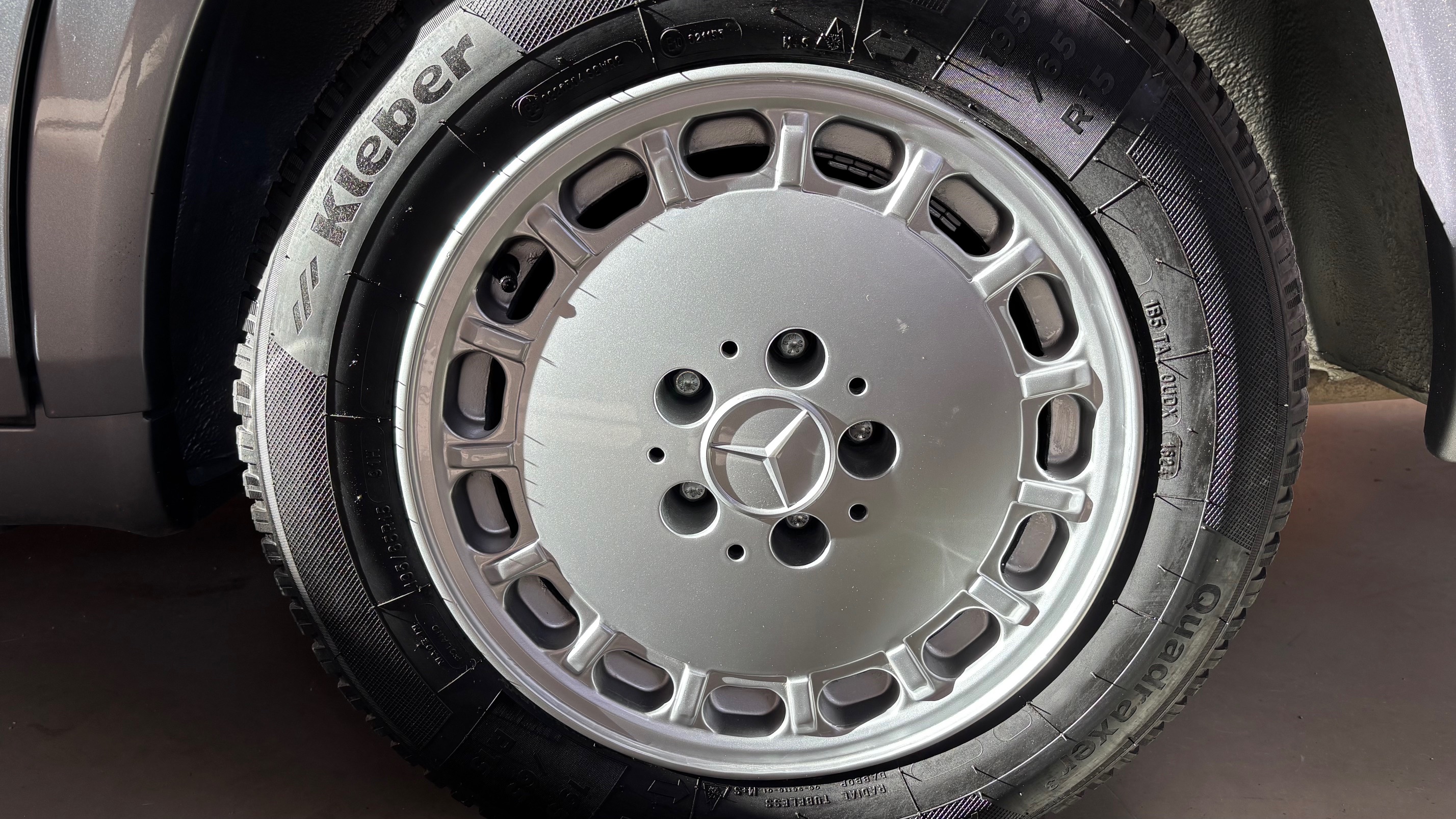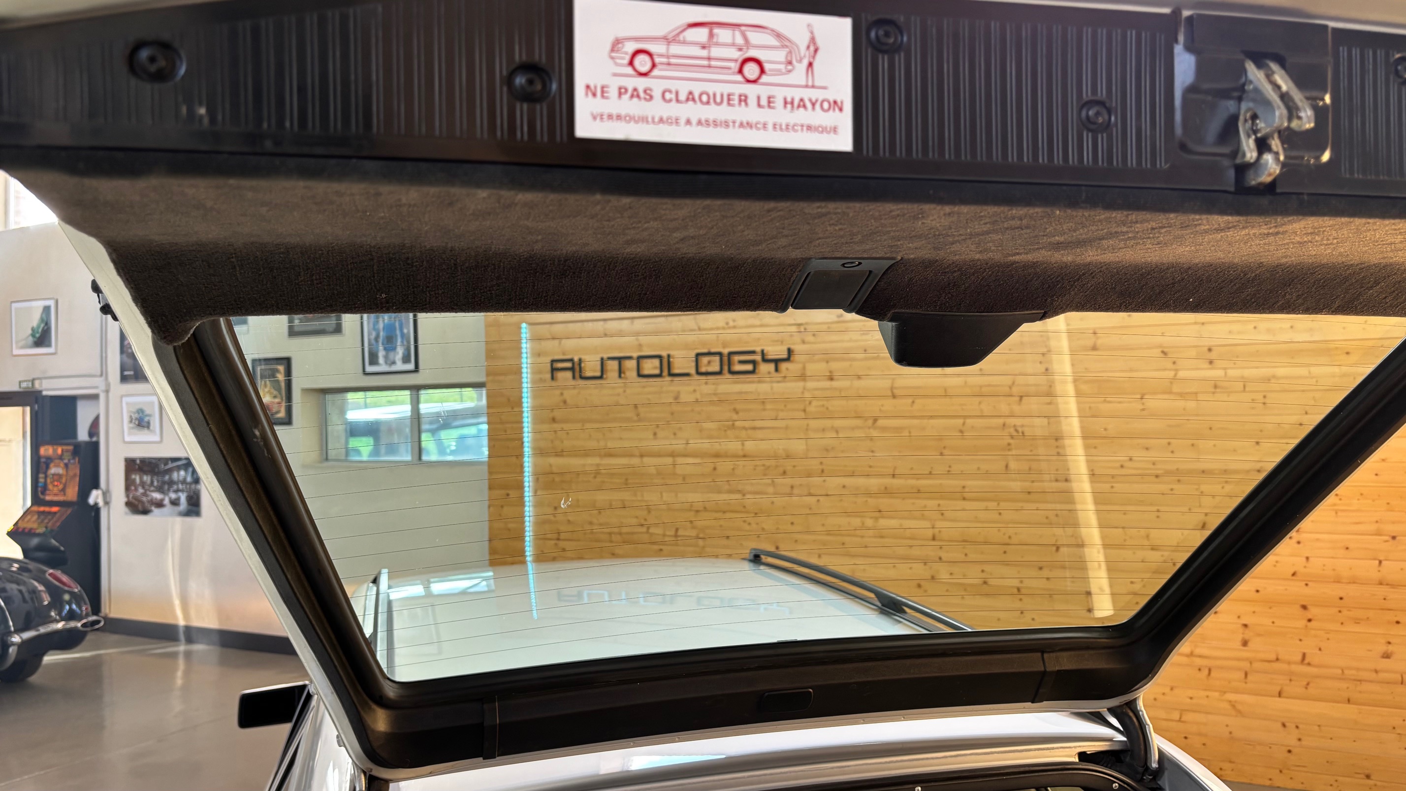 Ce modèle, argent astral/ tissu noir, était une version « Contact », lancée par le constructeur aux débuts des années 90. L’importateur Français voulait (dans sa grande générosité ?) proposer des modèles au tarif d’accroche plus accessibles. Il s’agissait des 190 d et 2.5 d ainsi que des 250 d, berlines et breaks. Concernant ce dernier, pour lequel le futur client devait tout de même à l’époque signer un chèque de 223354 francs, il se voyait supprimé : les deux miroirs de courtoisies éclairés, l’accoudoir central avant amovible et le cache bagages à enrouleur…Qui a dit mesquin ? Au-delà de ces considérations « marketing » d’un autre temps, notre modèle est absolument EXCEPTIONNEL. Il se présente dans un état que l’on peut comparer sans rougir à celui de sa livraison en mai 1991. Il ne présente aucune trace d’usure, son état « time capsule » indique qu’il a toujours été stocké au sec, sans humidité ni exposition solaire. L’ensemble des rapports de contrôle technique (depuis trente ans), ainsi que les factures, attestent sans le moindre doute de son kilométrage. Totalisant 91995 kms, les vidanges moteur, boîte, ont été réalisées. Inutile de préciser qu’il fonctionne comme un neuf, la boîte automatique lui conférant un confort et une douceur de conduite incomparable. N’ayant aucune option à part la peinture métallisée, nous avons choisi de vous proposer ce break équipé de jantes alliages 15 trous identiques aux optionnelles d’époque. Nous pourrons, si vous le souhaitez, le livrer avec ses roues et enjoliveurs d’origines.