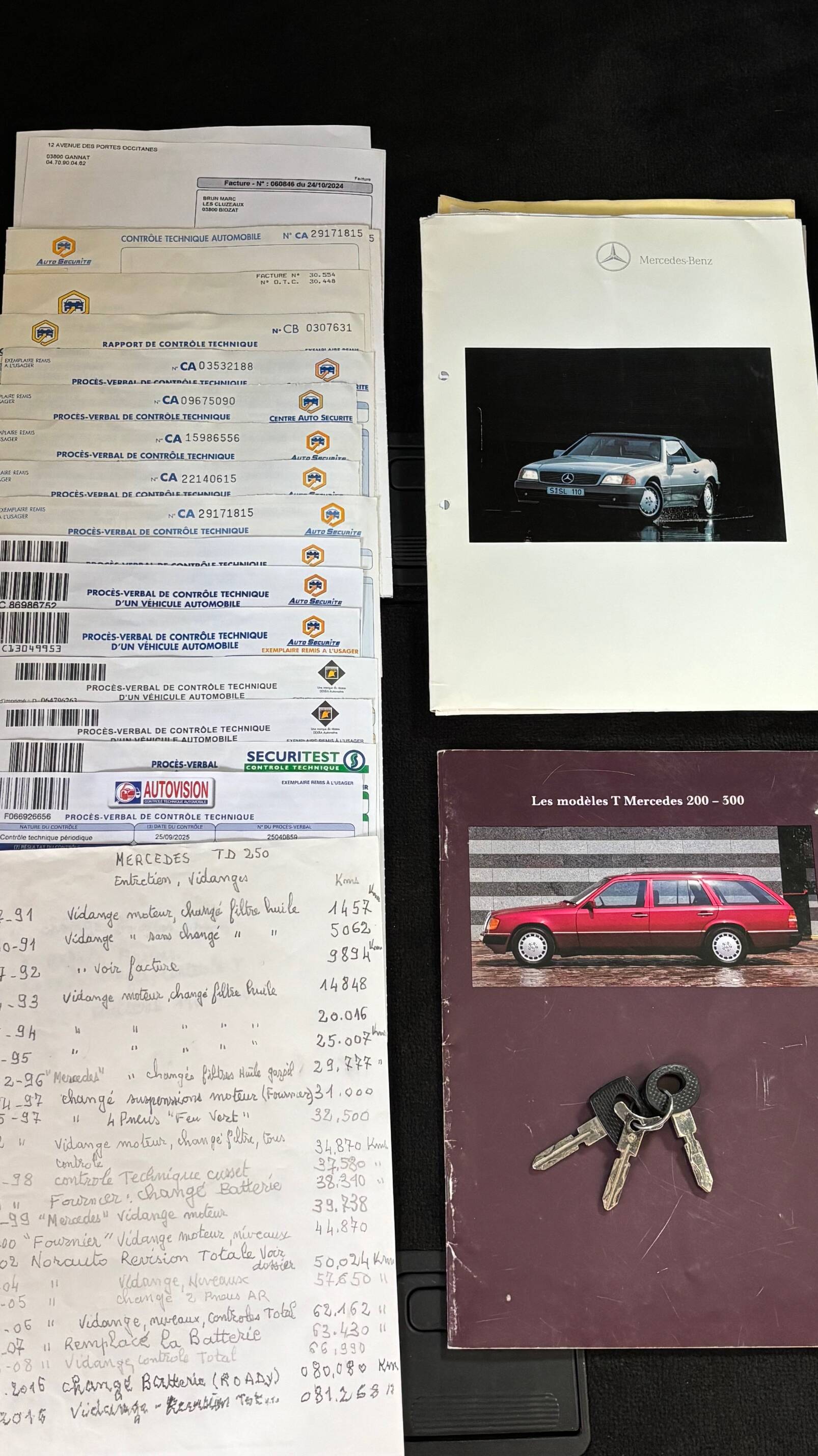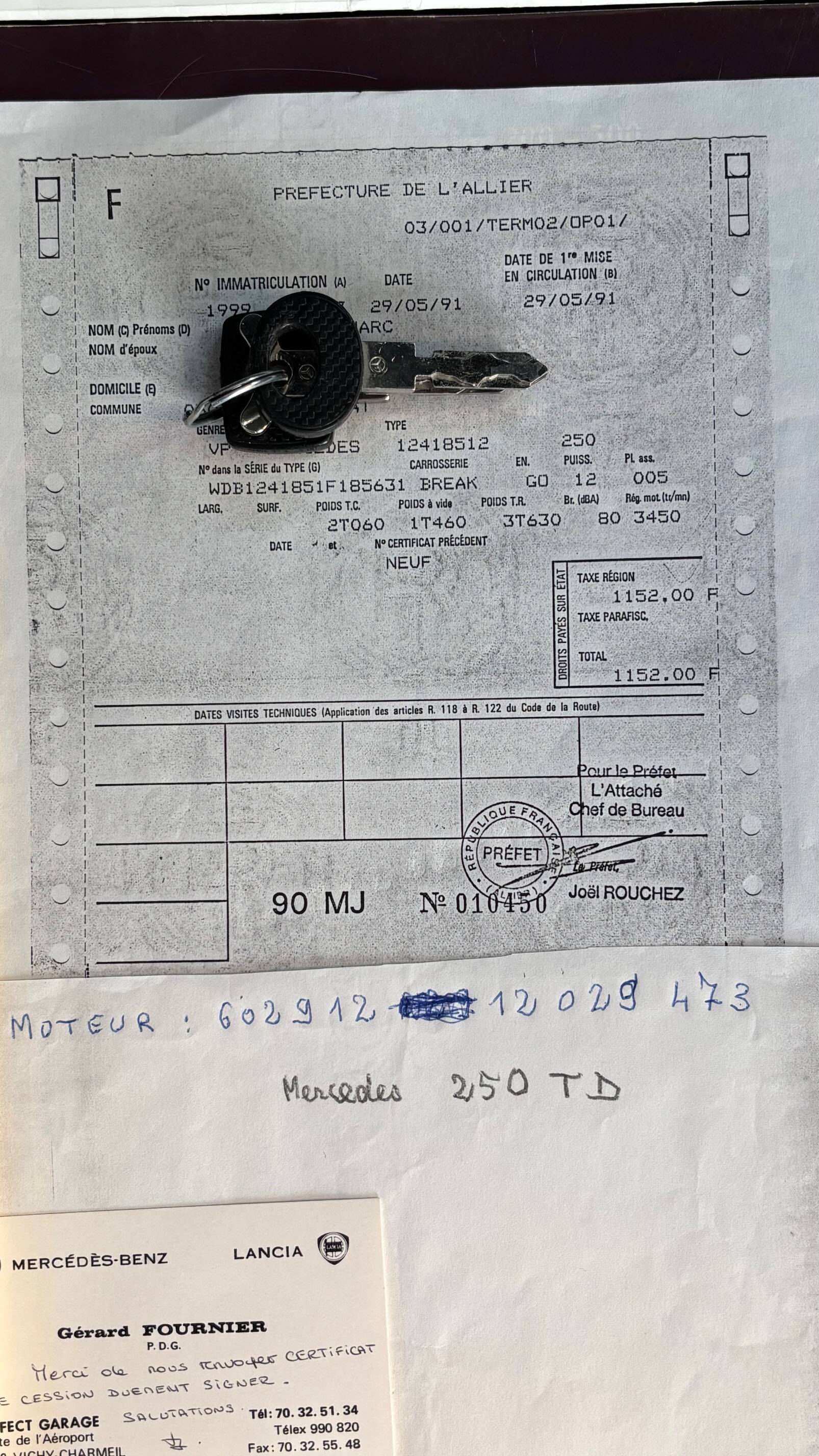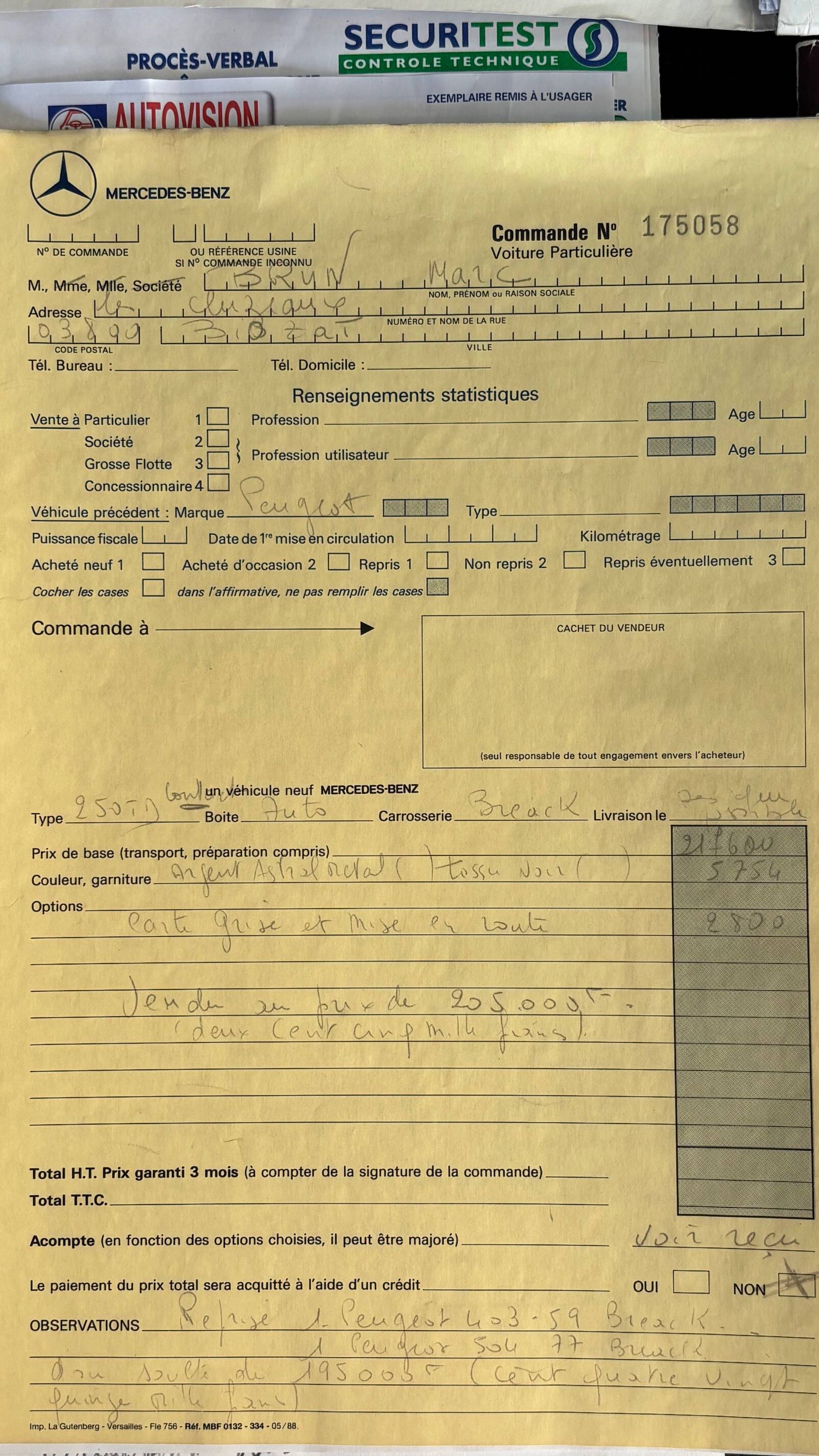 Il s’agit bien de ce modèle que nous vous proposons aujourd’hui, un break 250 td de 1991. Livré neuf à Vichy le 29 mai 91, nous possédons le bon de commande d’origine du premier propriétaire qui le conserva très méticuleusement jusqu’au 20 novembre 2024 à 87257 kms. On peut noter que cette voiture, commandée le 9 mars, fut la troisième et dernière voiture de ce conducteur très précautionneux : en effet il s’était fait reprendre à l’époque ses deux voitures précédentes : un break Peugeot 403 de 1959 et un break 504 de 1977 pour la somme de 10.000 francs …Les amateurs d’anciennes (comme nous) apprécieront … il le cèdera à son voisin à son entrée en maison de retraite à cette date .