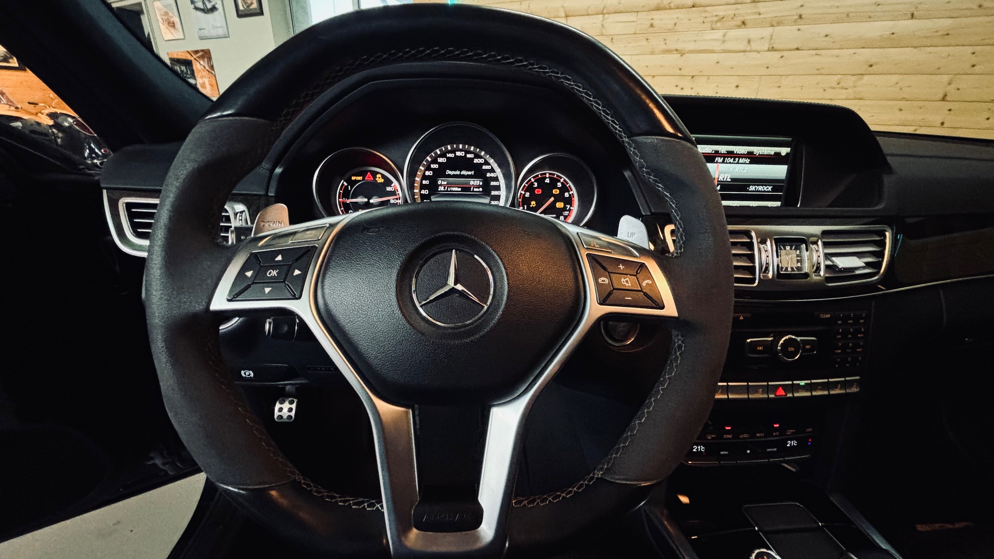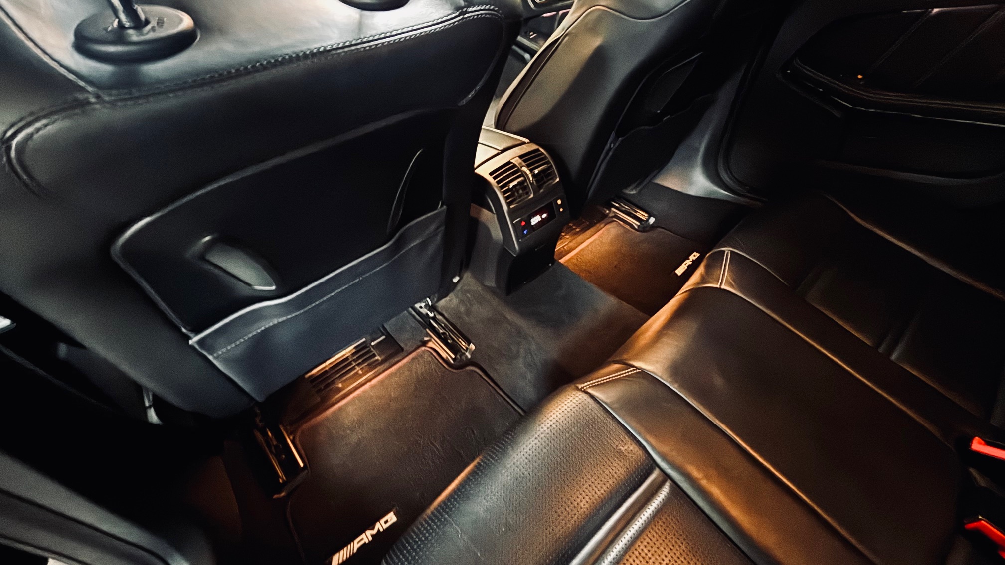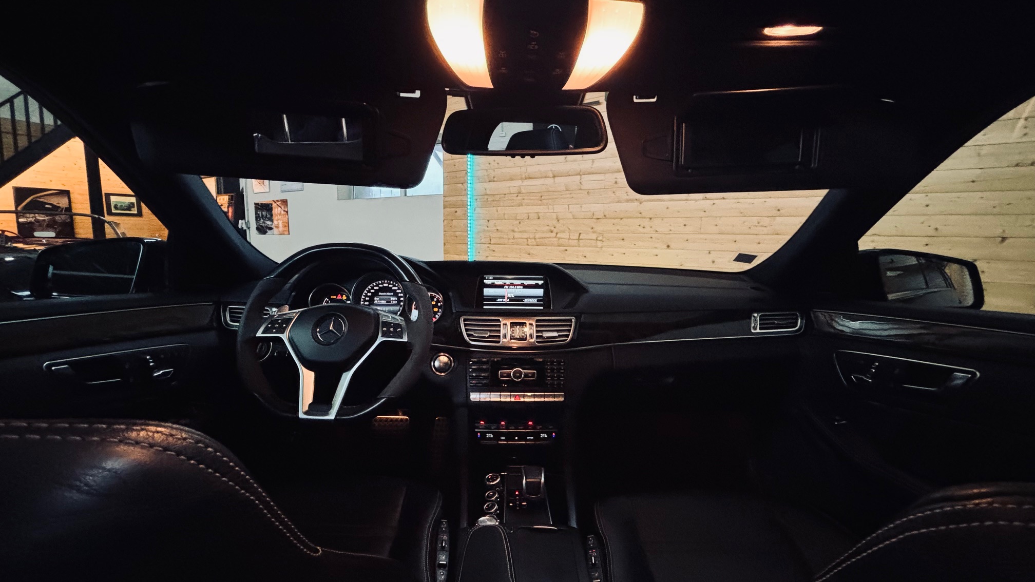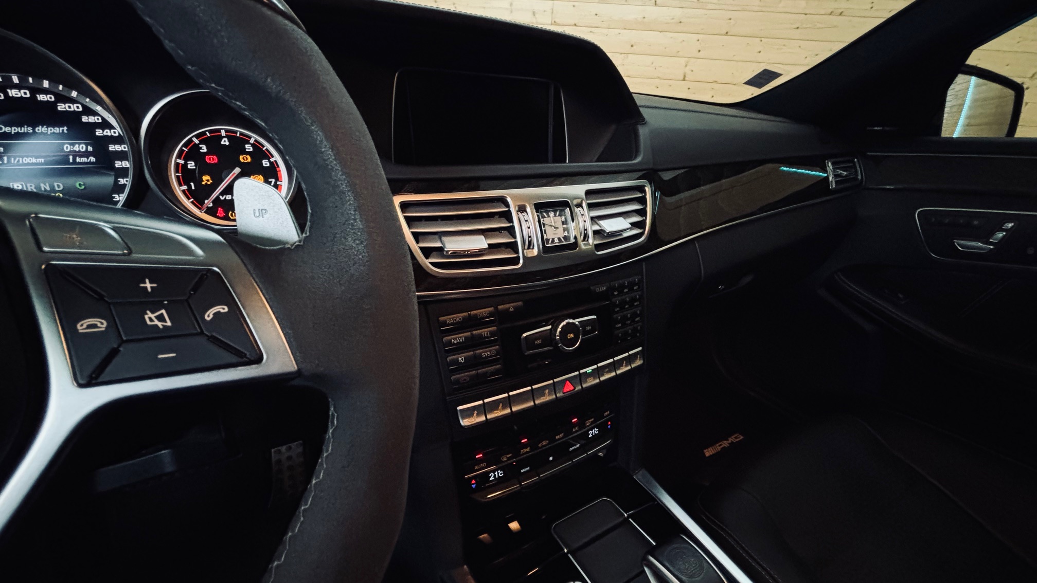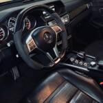 À l’intérieur, l’ambiance est sans équivoque : sport et luxe se mêlent avec justesse. Le cuir Nappa noir, les surpiqûres contrastées et les inserts en frêne noir créent une atmosphère à la fois élégante et agressive. Le volant AMG Performance en cuir et Alcantara permet de « prendre » la route avec douceur et brutalité, capable de changer de personnalité en une simple pression sur l’accélérateur. Les très nombreuse options dont est équipé notre modèle, dont les sièges chauffants/ventilés/dynamiques/massants à mémoire , lui confère une expérience de conduite unique.