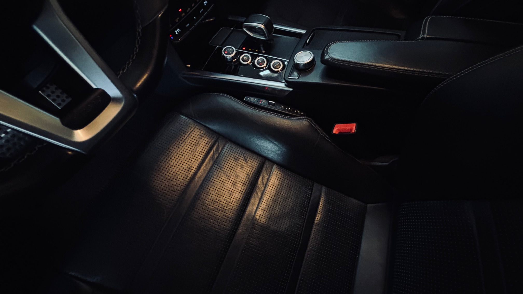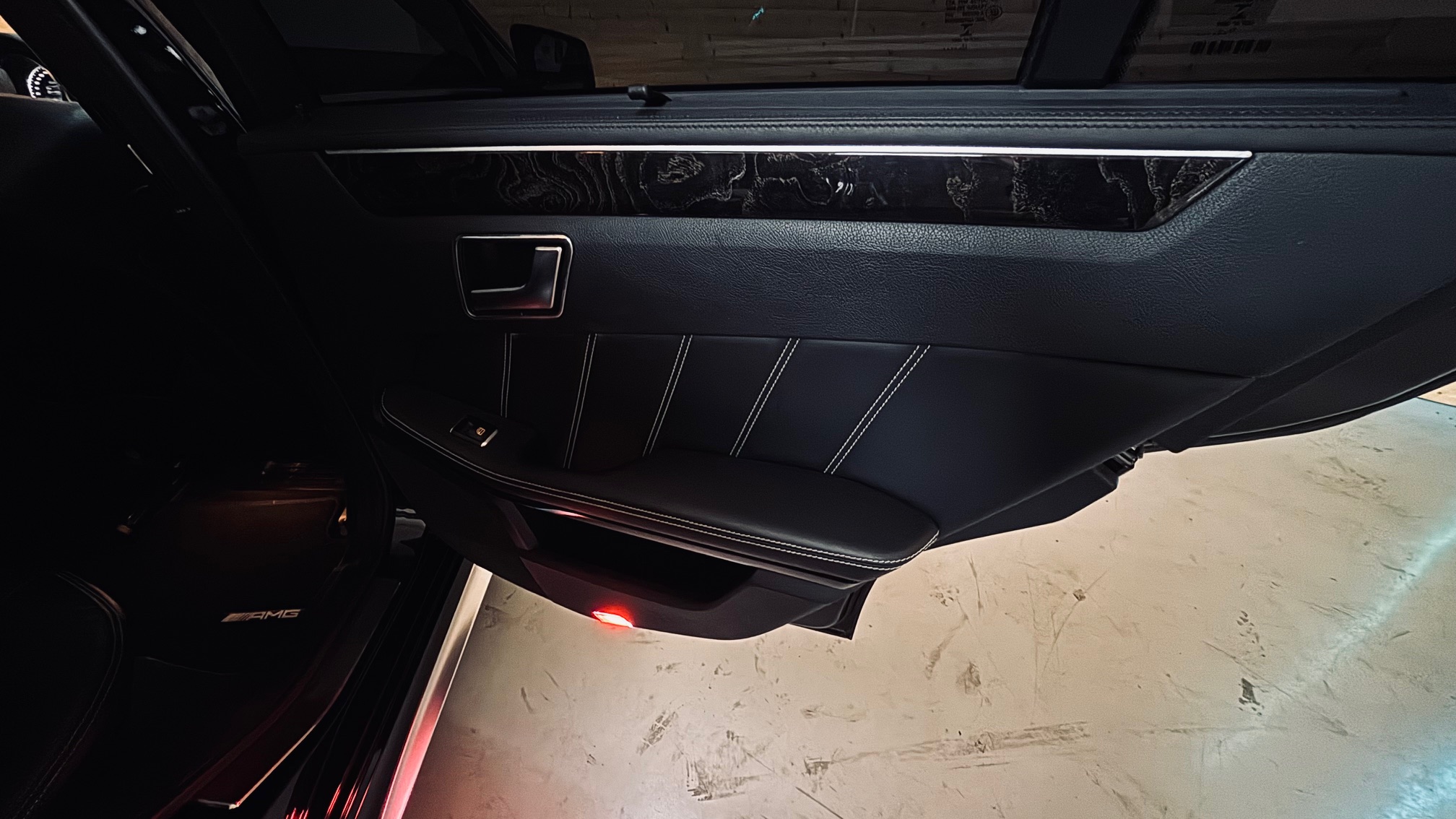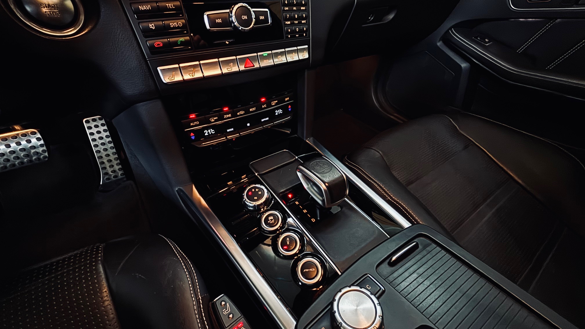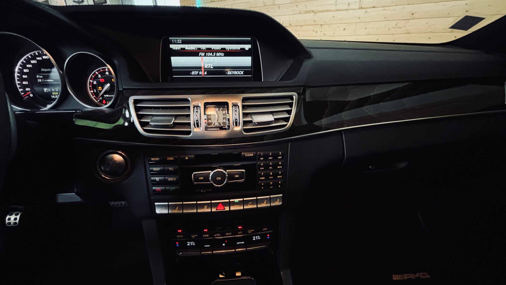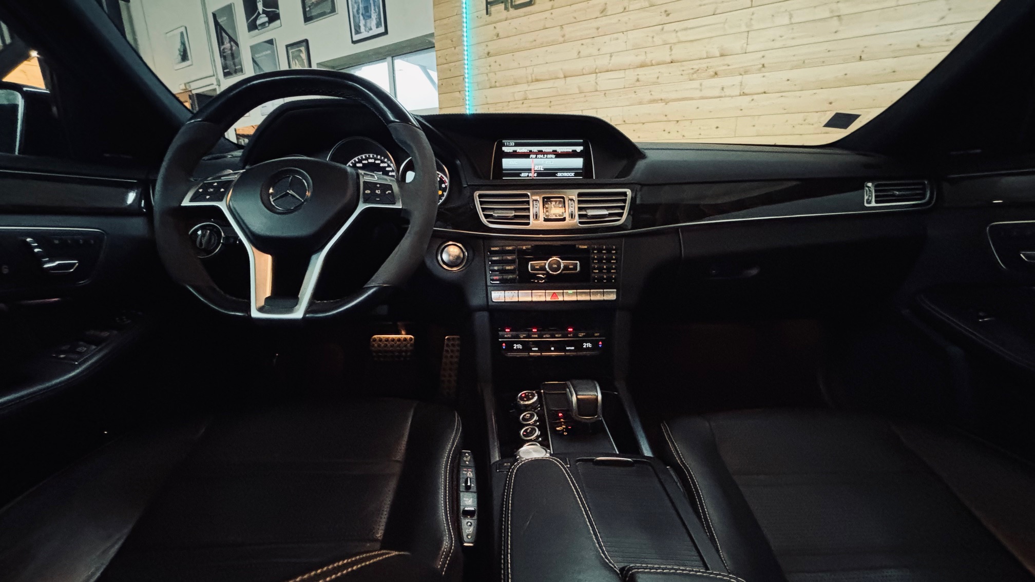 À l’intérieur, l’ambiance est sans équivoque : sport et luxe se mêlent avec justesse. Le cuir Nappa noir, les surpiqûres contrastées et les inserts en frêne noir créent une atmosphère à la fois élégante et agressive. Le volant AMG Performance en cuir et Alcantara permet de « prendre » la route avec douceur et brutalité, capable de changer de personnalité en une simple pression sur l’accélérateur. Les très nombreuse options dont est équipé notre modèle, dont les sièges chauffants/ventilés/dynamiques/massants à mémoire , lui confère une expérience de conduite unique.