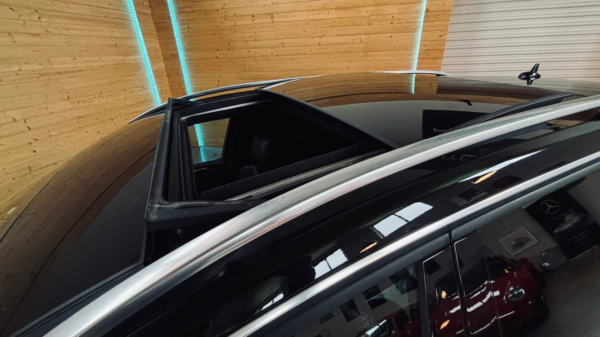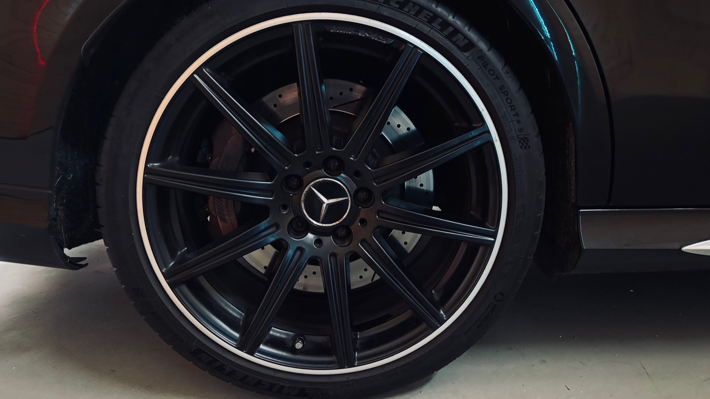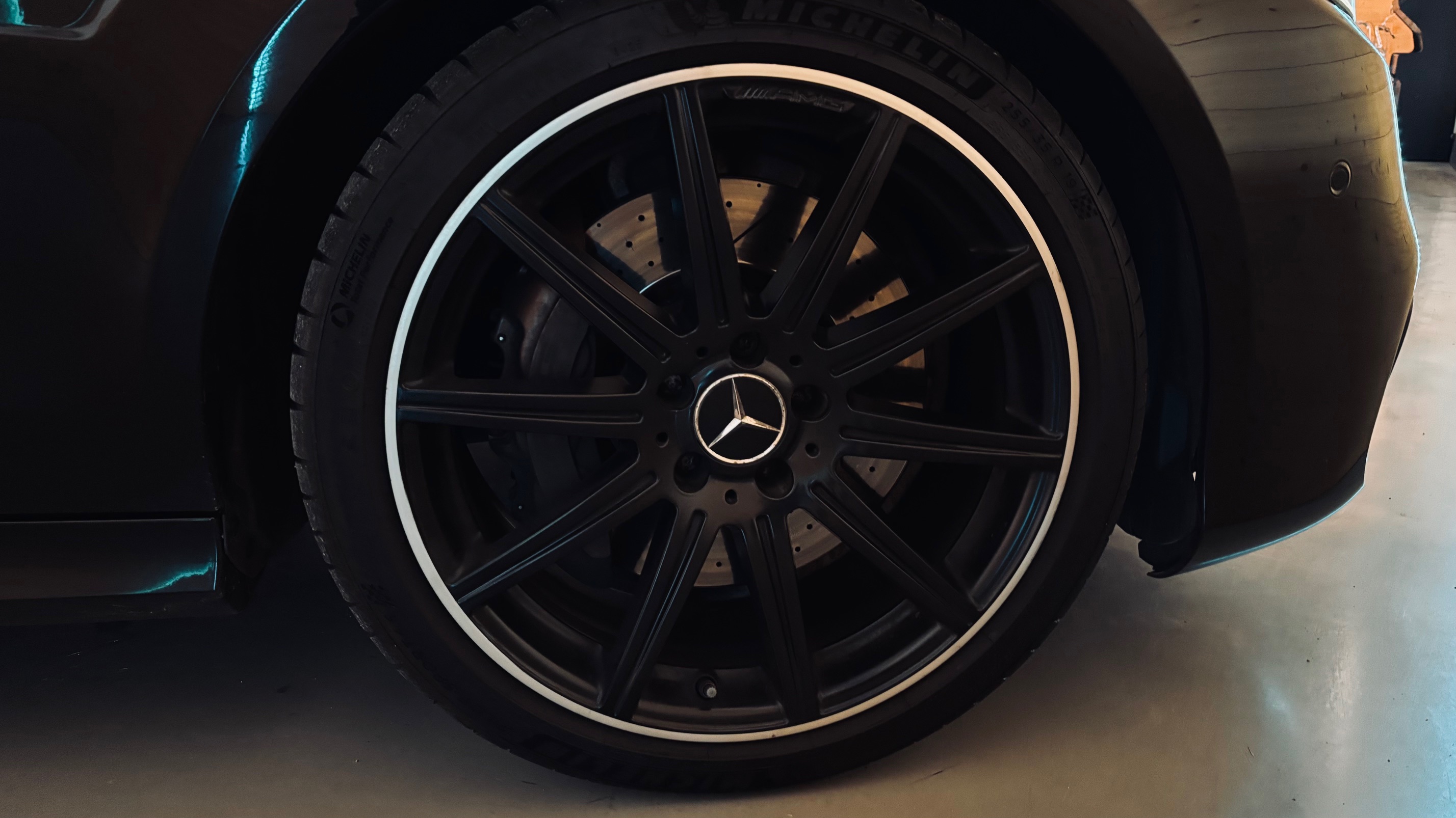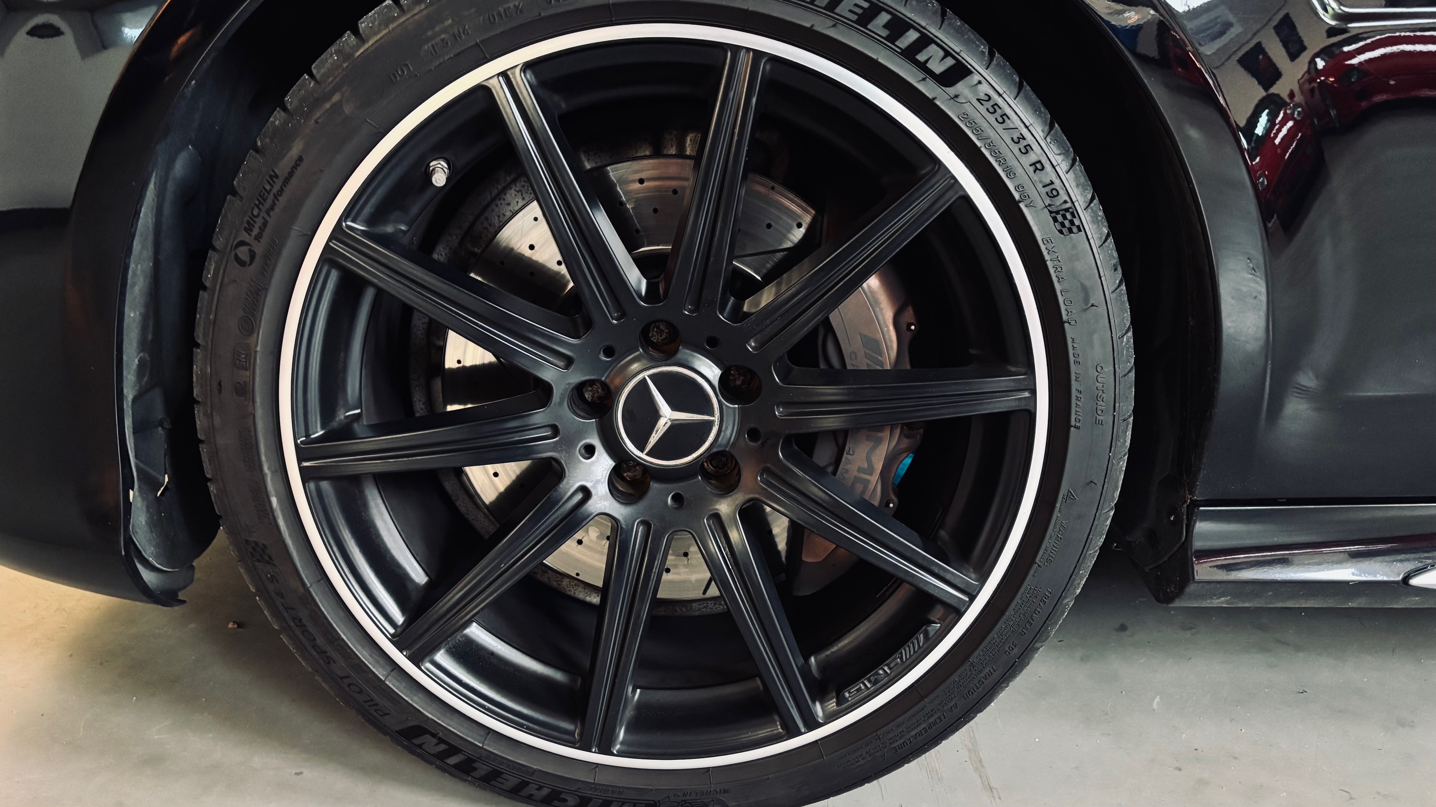 À l’intérieur, l’ambiance est sans équivoque : sport et luxe se mêlent avec justesse. Le cuir Nappa noir, les surpiqûres contrastées et les inserts en frêne noir créent une atmosphère à la fois élégante et agressive. Le volant AMG Performance en cuir et Alcantara permet de « prendre » la route avec douceur et brutalité, capable de changer de personnalité en une simple pression sur l’accélérateur. Les très nombreuse options dont est équipé notre modèle, dont les sièges chauffants/ventilés/dynamiques/massants à mémoire , lui confère une expérience de conduite unique.