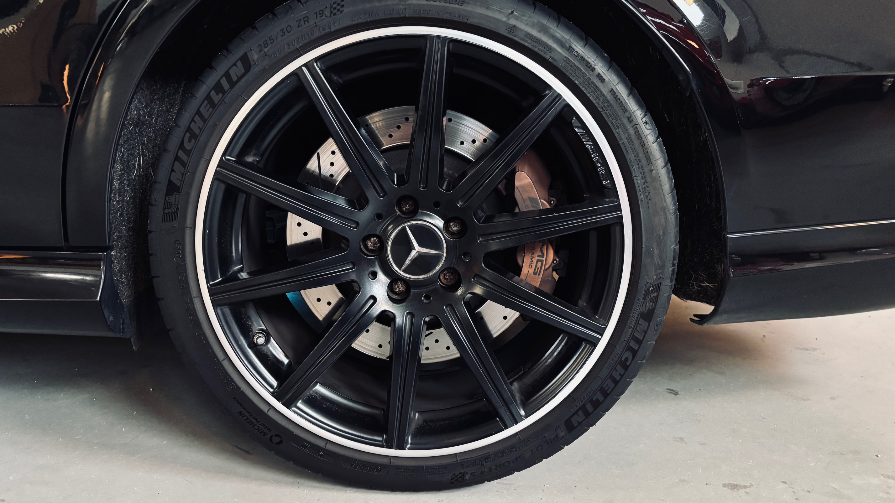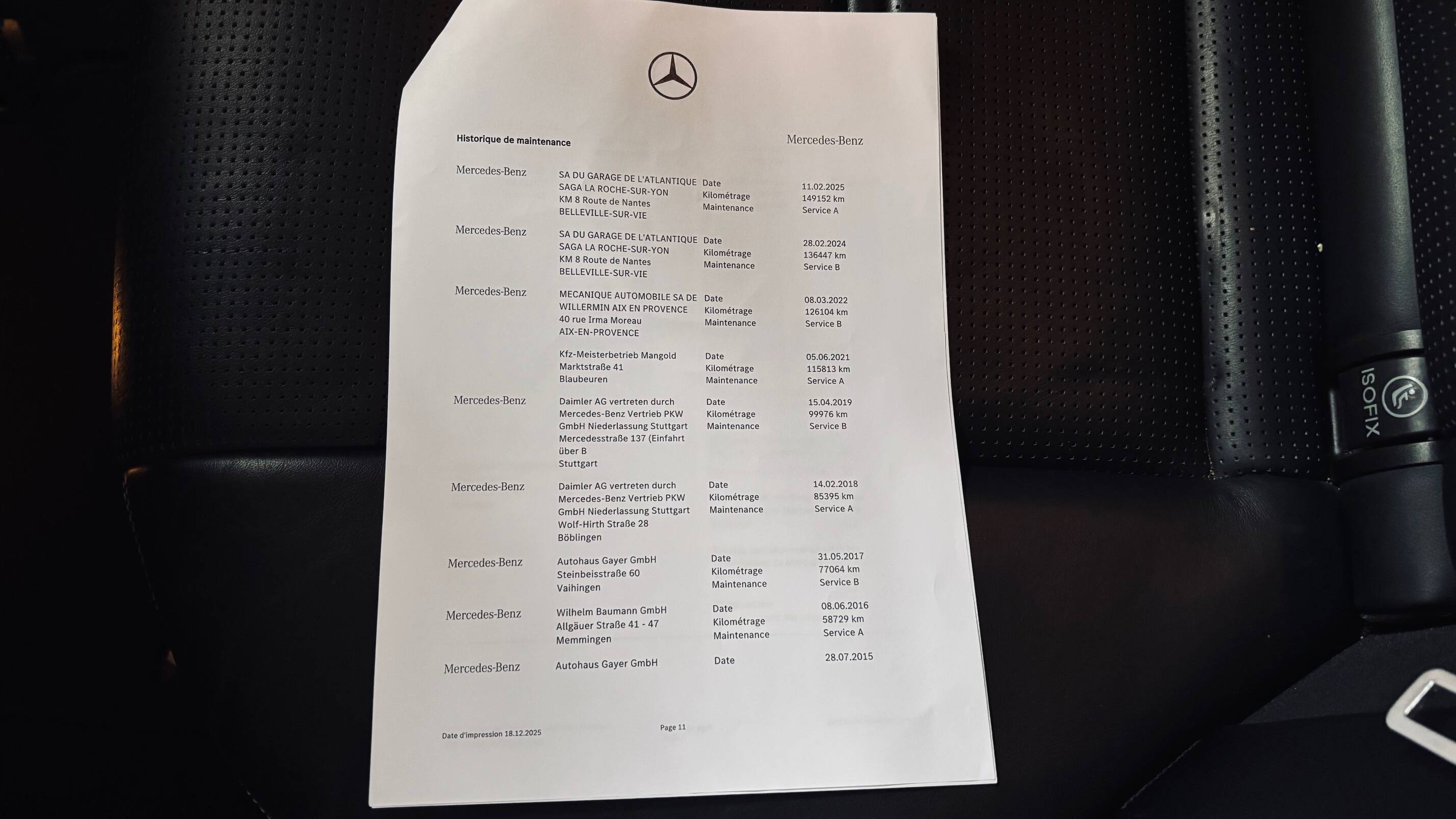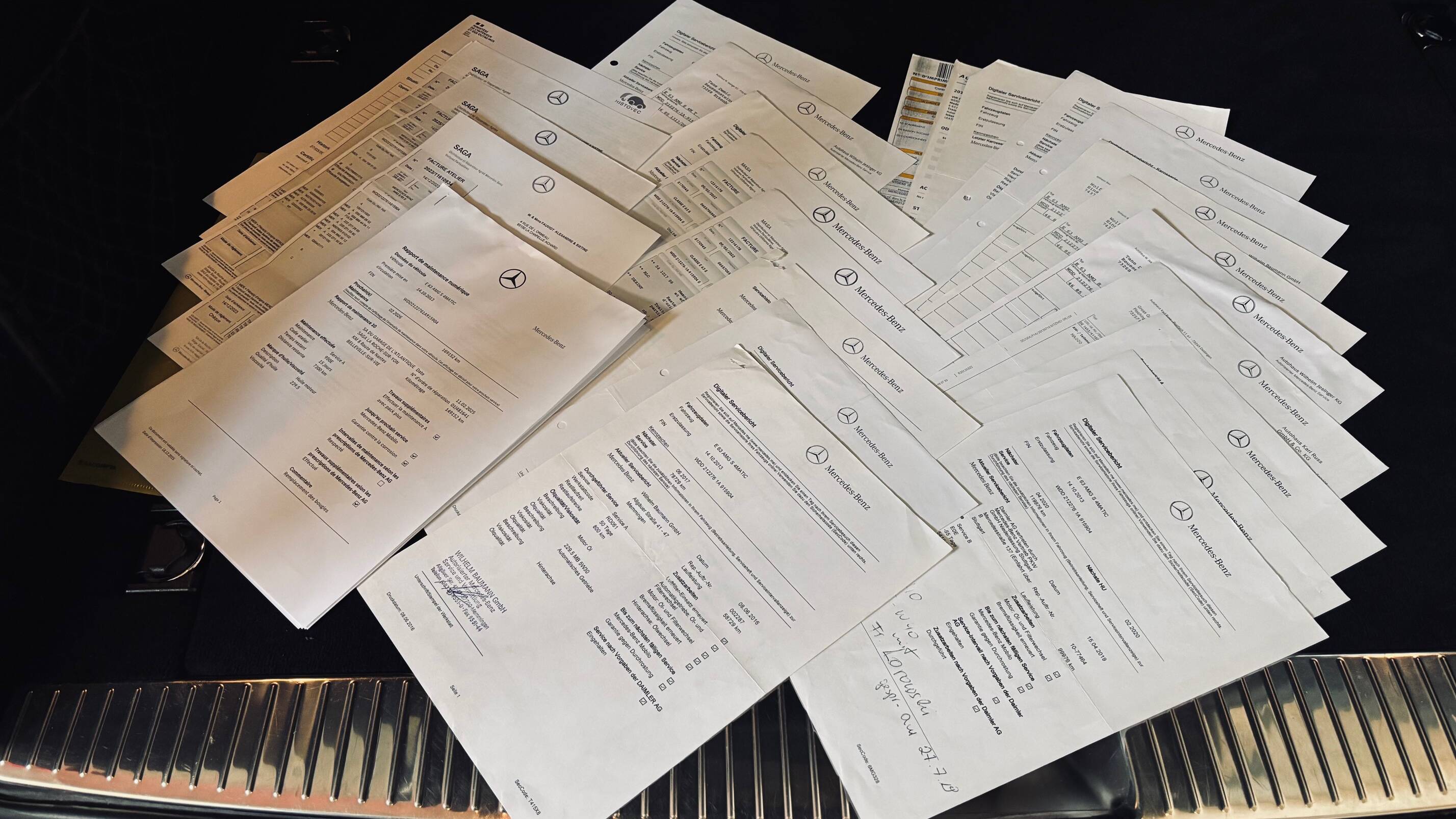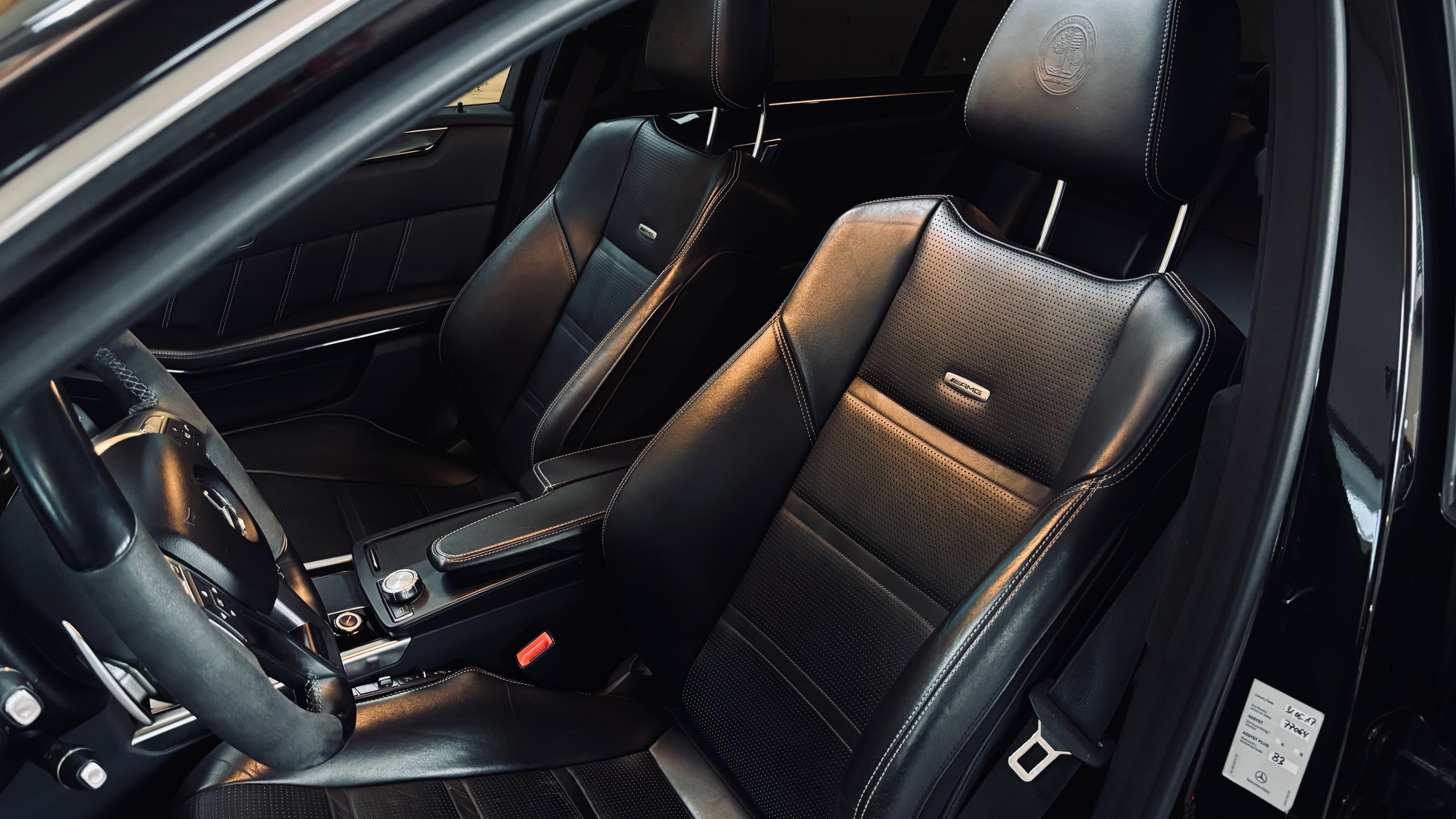 L’exemplaire que nous vous proposons aujourd’hui a été mis en circulation le 14 octobre 2013 et affiche 161 574 kilomètres. Fidèle à l’image de rigueur allemande, cette E63 a bénéficié d’un suivi INTEGRAL au sein du réseau Mercedes-Benz, comme en atteste un historique limpide et complet de factures. Un entretien méticuleux qui témoigne du soin apporté à cette automobile tout au long de sa vie. Le service des 160.000 kms sera éffectué à la concession de Limoges pour la livraison à son nouveau propriétaire.