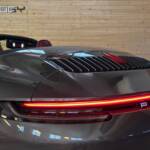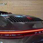 Le rappel historique de toutes les versions qui s’enchaînent depuis serait trop long et fastidieux puisque nous sommes aujourd’hui à la huitième génération de 911 : baptisée 992, elle est présentée en novembre 2018, succédant à la 991. Son design immédiatement identifiable reste dans la continuité de sa devancière avec une évolution notable pour l’arrière. Petit détail, outre le nouveau bandeau lumineux, le troisième feu de stop arbore un dessin inédit : il prend la forme d’une double barrette verticale qui se confond avec les lamelles de la grille. Leur nombre fait référence au modèle « 911 » :neuf barrettes noires suivi de deux rouges et inversement…