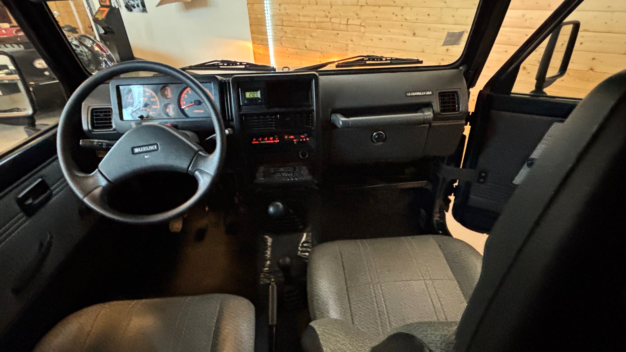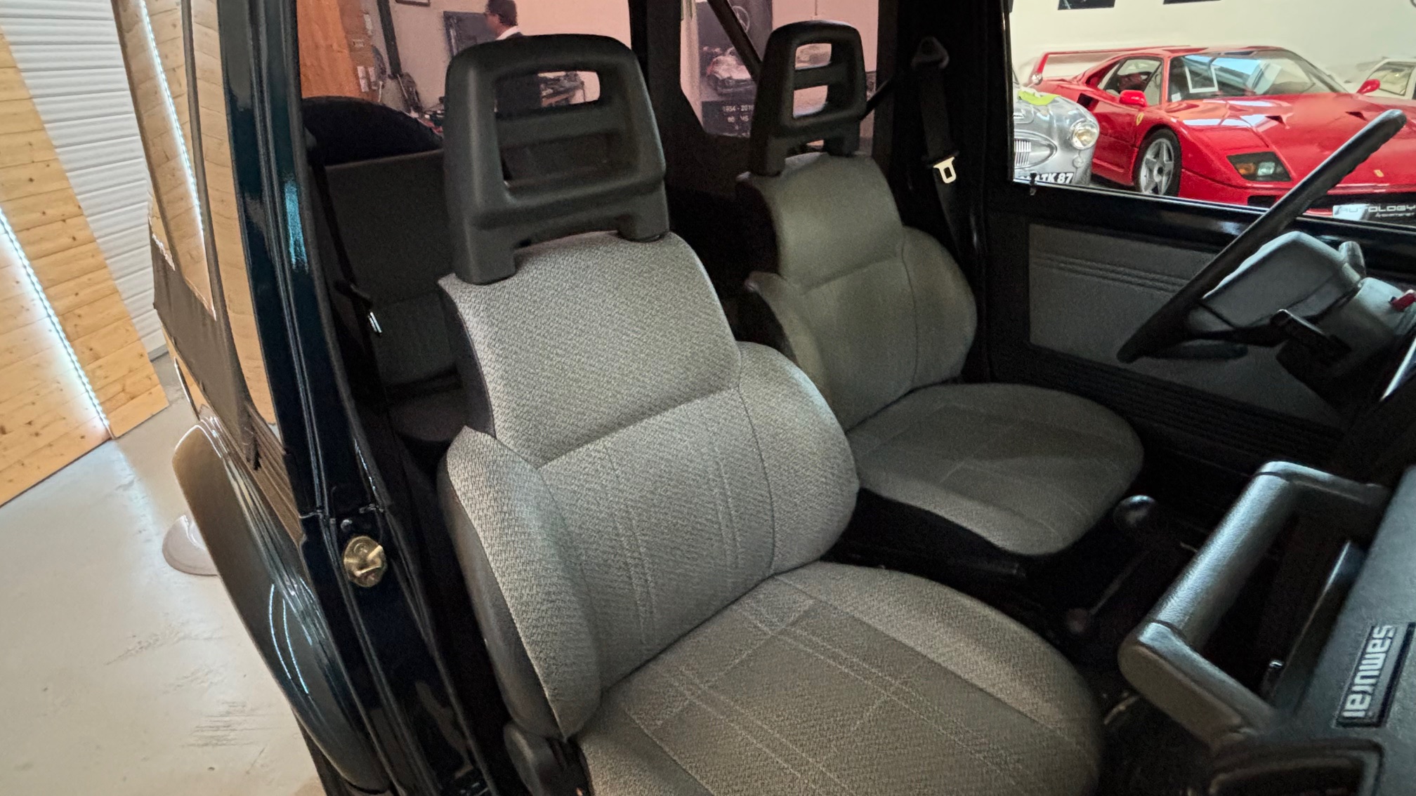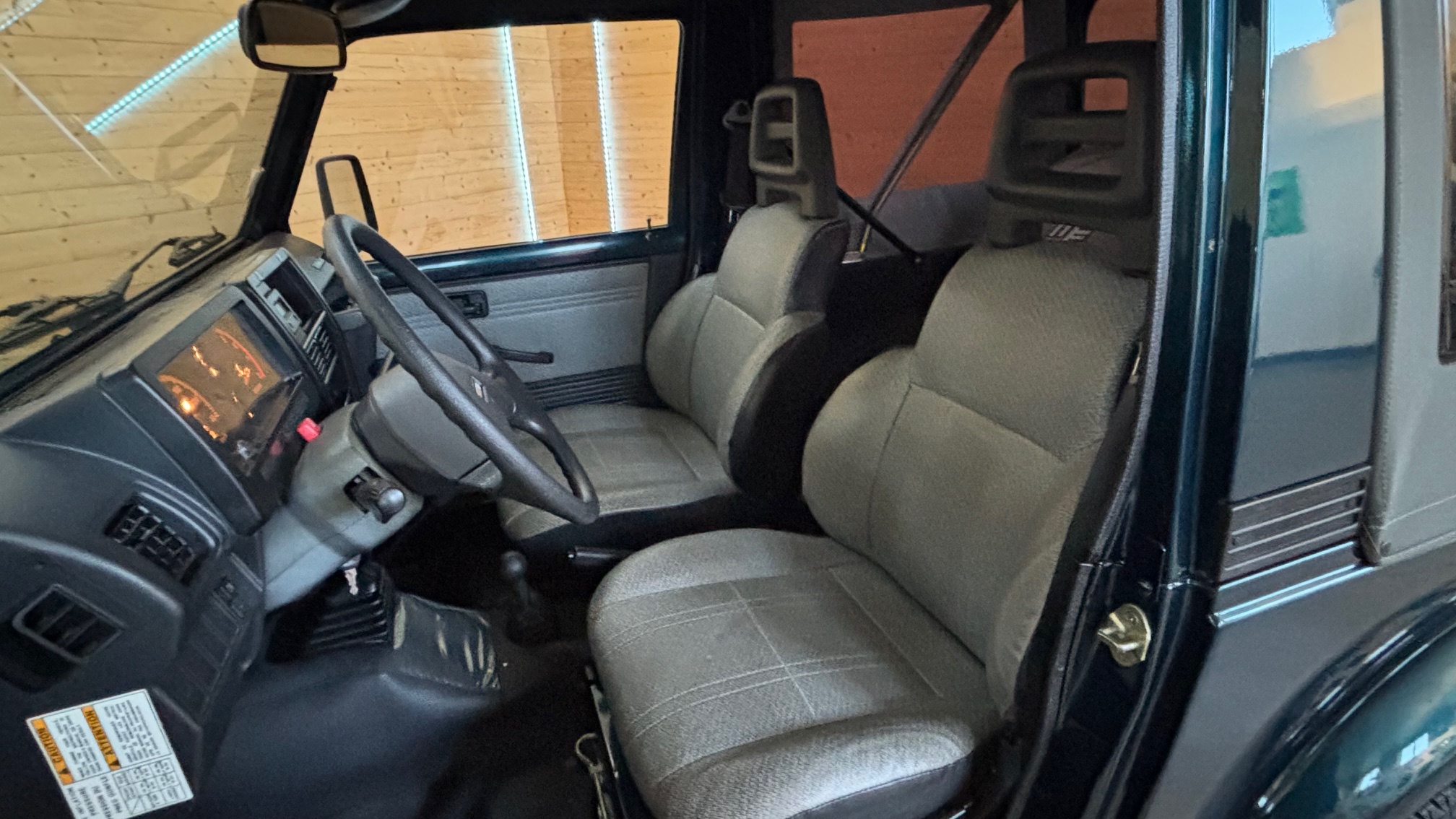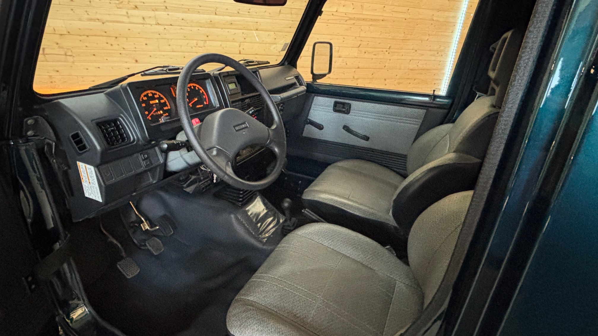 Il est proposé dans un rare coloris d’origine « aqua green métalic « avec sa capote taupe et son intérieur gris assorti. Ce Santana a été immatriculé le 5 juillet 1995 (donc modèle 1996) par la concession Suzuki de Limoges en véhicule de démonstration, et a été vendu à son premier propriétaire le 20 octobre 1995 qui le conservera jusqu’en septembre 2025 ! Son Samourai n’était utilisé que pour se rendre sur son lieu de travail par beau temps et quelques ballades dominicales … c’est tout ! Il a donc parcouru qu’un peu plus de 1500 kms par an, mais toujours régulièrement, ce qui explique son très faible kilométrage.